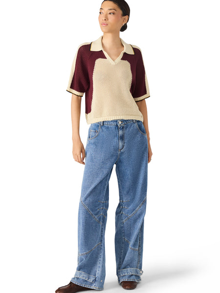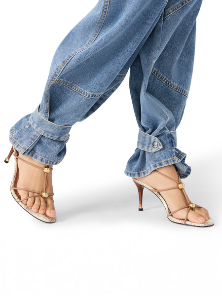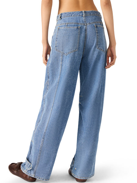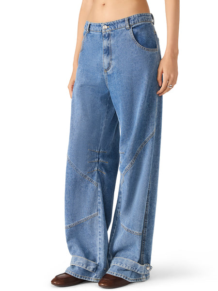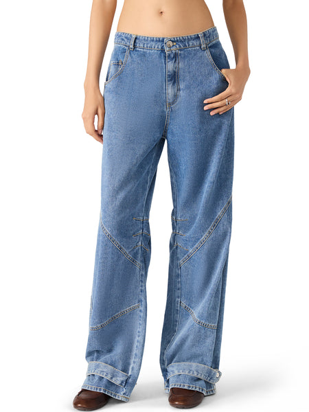 These denim pants are a fresh twist on a classic wide-leg jean, designed with a modern, fashion-forward edge. Crafted from a medium-wash denim, they feature unique seam detailing across the legs that adds structure and dimension. The relaxed, slouchy fit sits comfortably at the waist with a traditional button-and-zip closure, while the extra-wide cuffs are finished with button tabs—giving you the option to style them loose or cinched for a playful, street-style vibe. Perfect for pairing with sneakers, boots, or even heels, these jeans transition effortlessly from casual daytime wear to a statement-making evening look.