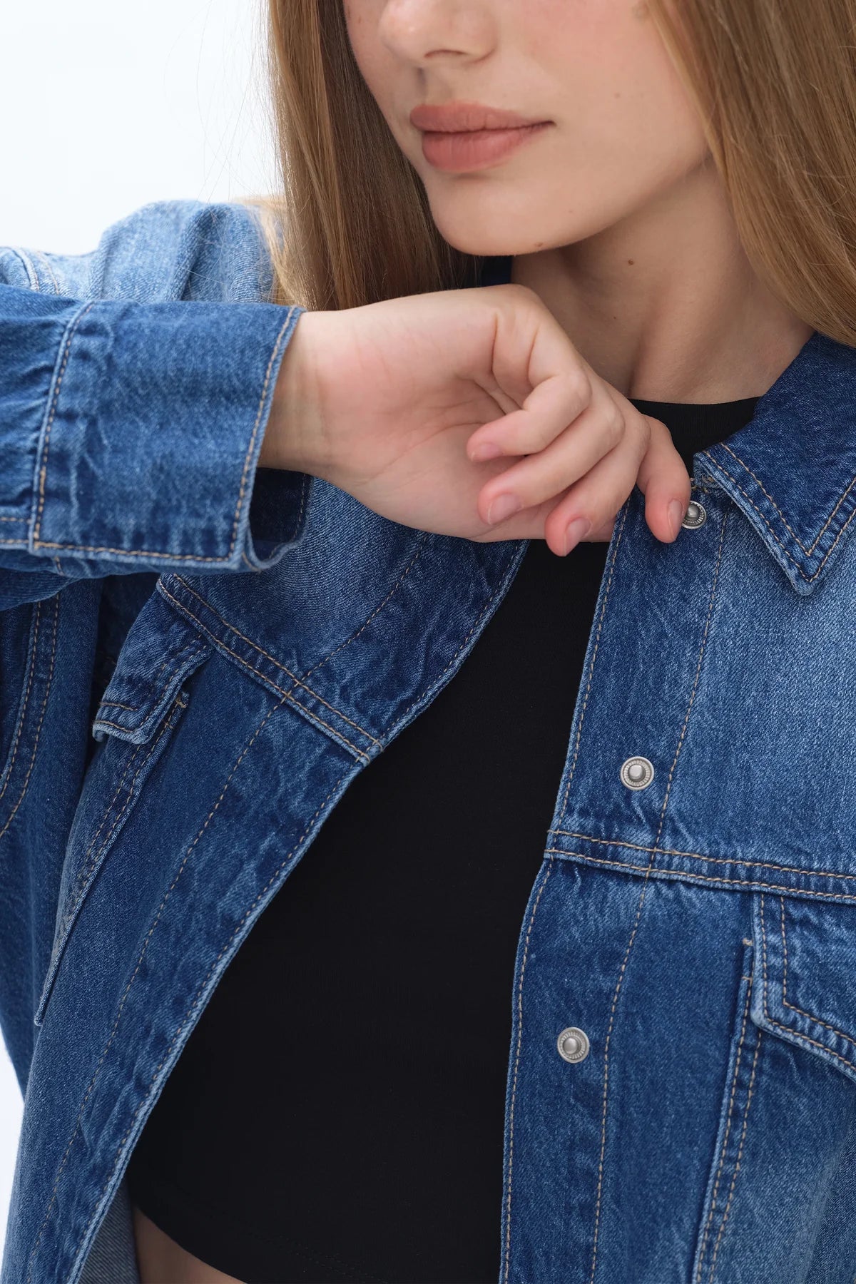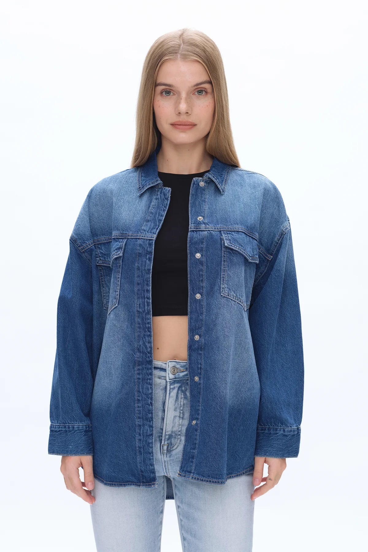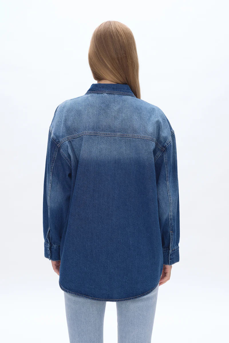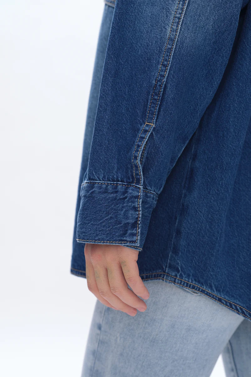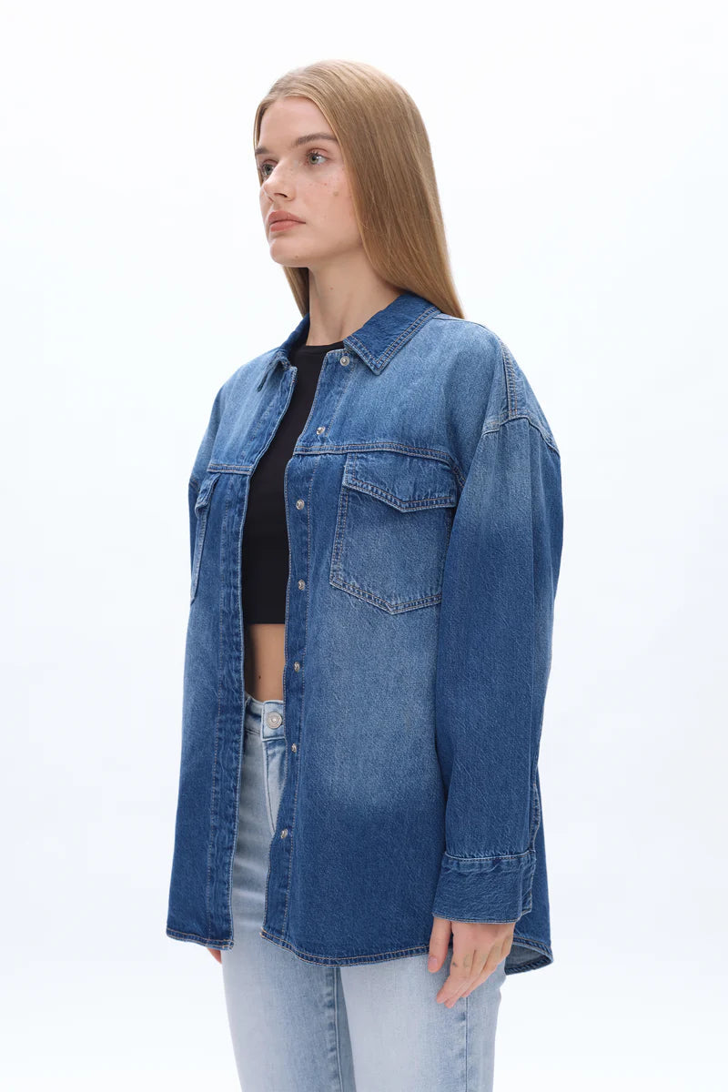 This oversized denim shirt jacket is crafted from low-stretch denim that holds its shape while still feeling comfortable and easy to wear. Designed with a relaxed, boyfriend-inspired fit, it features classic snap-button closures down the front and at the cuffs for effortless layering. The structured collar, chest flap pockets, and subtle fading add a timeless, lived-in look, while the longer length gives it that perfect throw-on-and-go feel. Ideal for wearing open over tees or tanks or buttoned up as a lightweight jacket, this piece is a versatile staple you’ll reach for season after season.