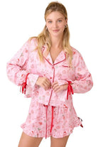 This pink satin pajama set is as sweet as the season itself. Featuring a whimsical Christmas print with gingerbread men, ornaments, gifts, and festive bows, the silky fabric feels soft and smooth against the skin for a touch of luxury even in lounge mode. The button-up top includes a notched collar trimmed with red piping and darling ribbon ties at the cuffs for a playful feminine finish. Matching ruffle-hem shorts with a drawstring waist complete the look, offering both comfort and charm. Perfect for cozy nights in, holiday mornings, or gifting to someone who loves a little sparkle and cheer in their sleepwear.