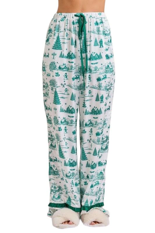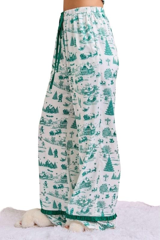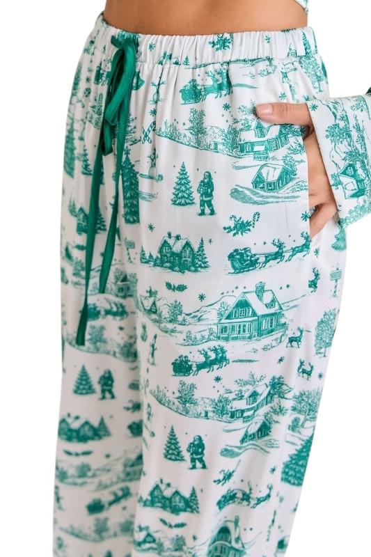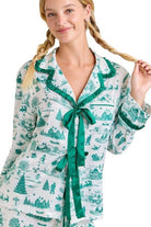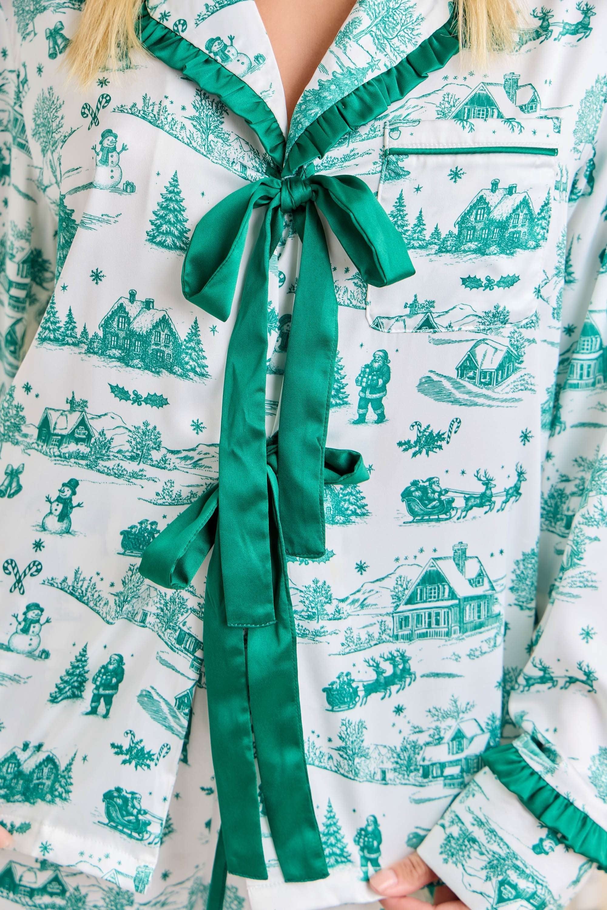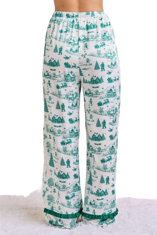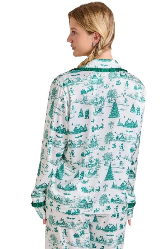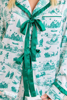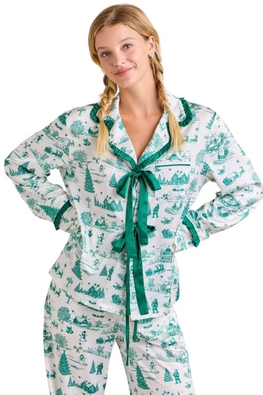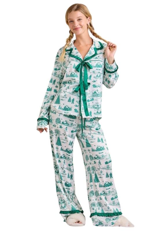 This Christmas Toile Print Pajama Set brings a touch of nostalgic holiday charm to cozy lounging. The silky satin fabric showcases a whimsical green toile print featuring festive winter scenes — from snow-covered cottages to cheerful snowmen and pine trees. The top features ruffled trim detailing and an elegant satin bow tie at the neckline, while the pants offer a relaxed fit with an elastic drawstring waist and ruffle-trim cuffs for a feminine finish. Smooth, lightweight, and irresistibly festive, this set makes the perfect gift or Christmas morning outfit — equally cute for matching family photos or sipping cocoa by the tree.
