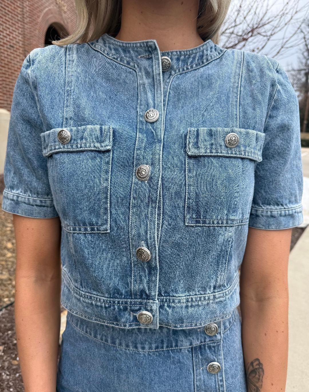 This cropped denim shirt jacket brings a modern, tailored feel to classic denim. Designed with short sleeves and a structured silhouette, it features a clean collarless neckline, front button closure, and utility-inspired chest pockets finished with statement metal buttons. The slightly boxy, cropped length hits just right at the waist, making it perfect for pairing with high-rise bottoms or wearing as a lightweight layer over tanks, tees and dresses. Polished yet effortless, it’s an easy piece to dress up or down. Get the matching skort HERE.