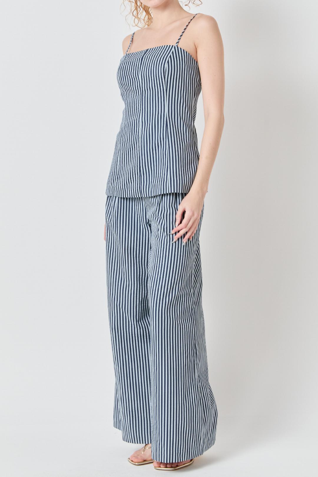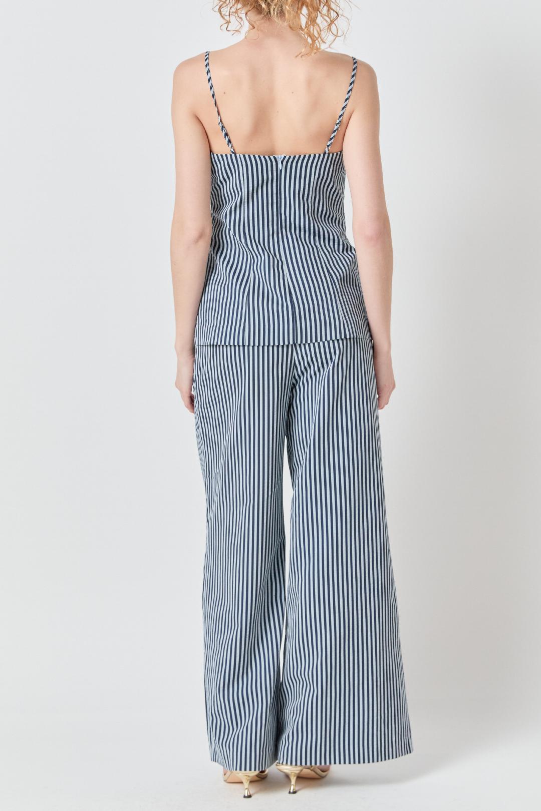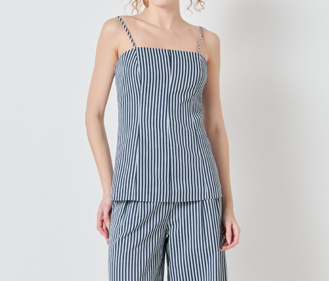 This striped camisole top features a clean, tailored silhouette with a straight neckline and slender adjustable straps for a custom fit. The vertical navy and lighter blue stripe pattern elongates the look, while subtle seam detailing through the bodice creates a flattering, lightly structured shape without feeling stiff. Crafted from a lightweight woven fabric, it drapes smoothly against the body and pairs effortlessly with the matching wide-leg pants or your favorite denim for a polished warm-weather look.