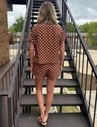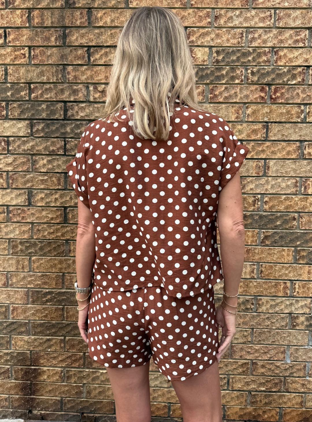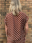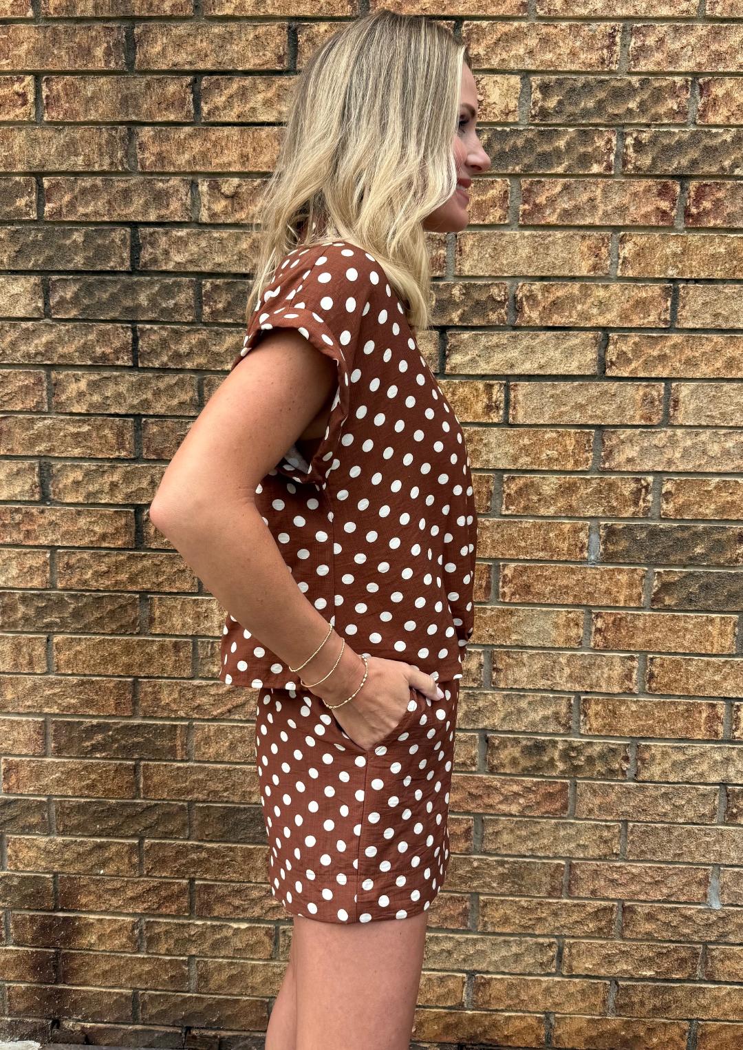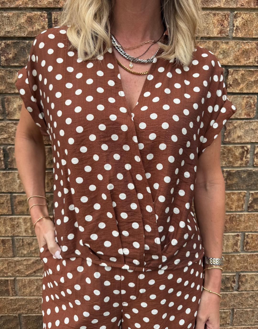 This effortless top features a rich brown base with classic ivory polka dots for a timeless yet playful feel. Designed in a flattering surplice silhouette, the neckline is sewn at the V for easy, worry-free wear while still giving that softly draped look. The front hem is gathered and lightly pleated, creating a bloused effect that sits perfectly at the waist. Finished with short rolled sleeves and a relaxed fit, this top offers an easy balance of polished and laid-back style. Style with the matching shorts, denim or trousers.