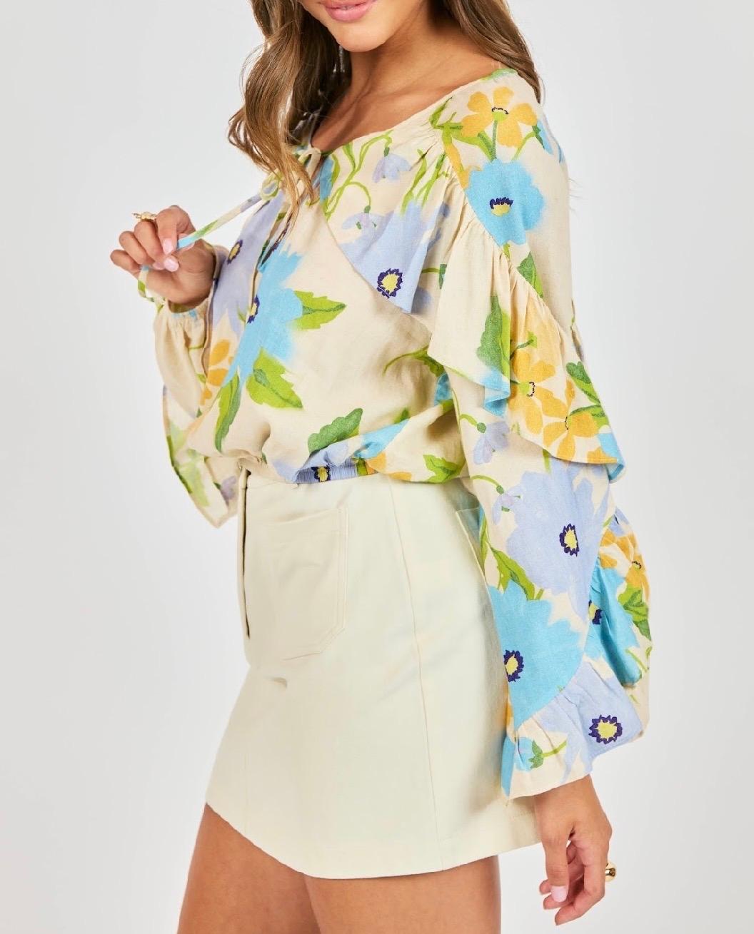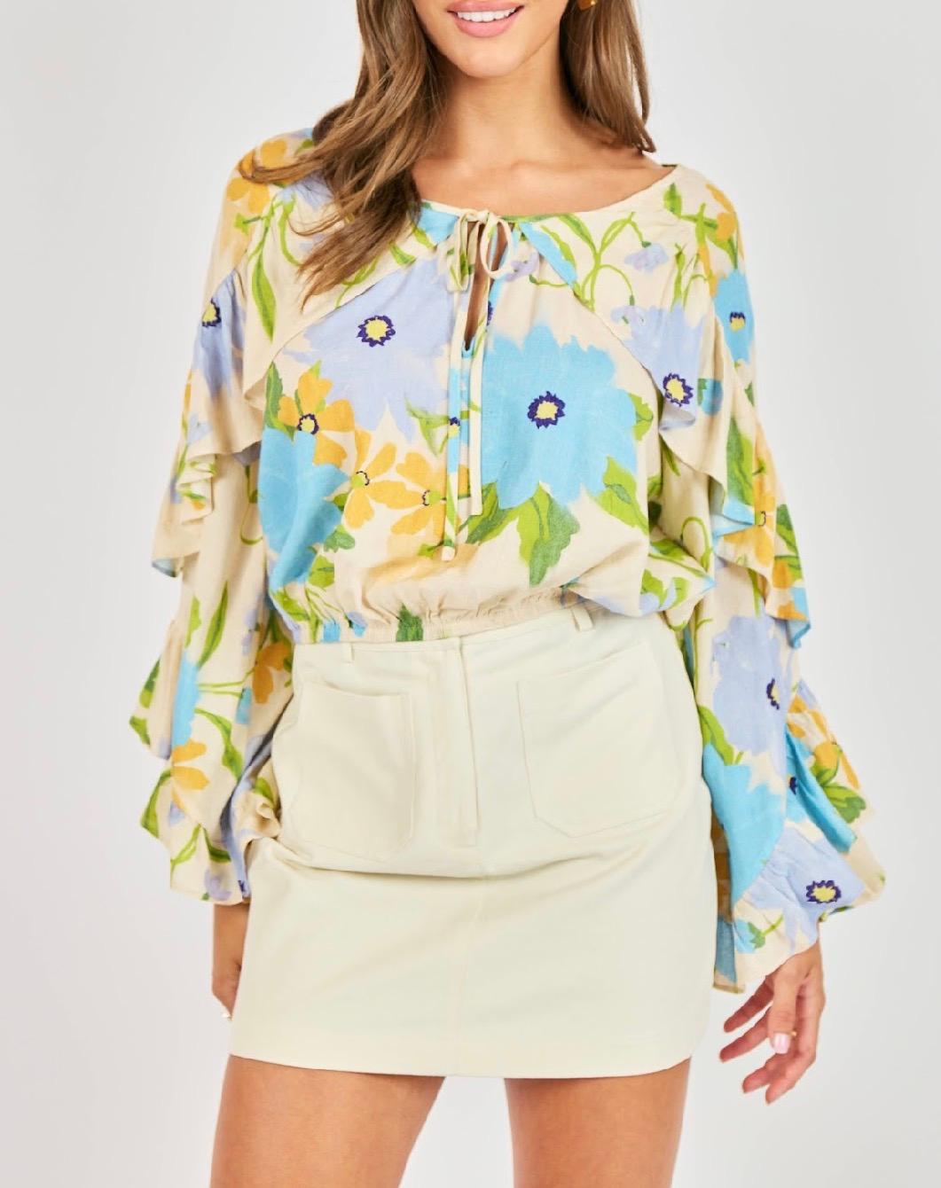 This airy floral top is designed with an easy, feminine drape and a flattering elastic hem that gently blousons at the waist, giving it that "tucked" look. Made from a lightweight woven fabric, it features a soft scoop neckline with an adjustable tie detail and romantic layered ruffle sleeves that add movement and charm. The elasticized hem keeps the silhouette relaxed yet polished, making it perfect to wear untucked with skirts or high-rise denim. Effortless and breezy, it’s a go-to piece for spring days, weekend brunch, or dressed-up casual looks.