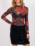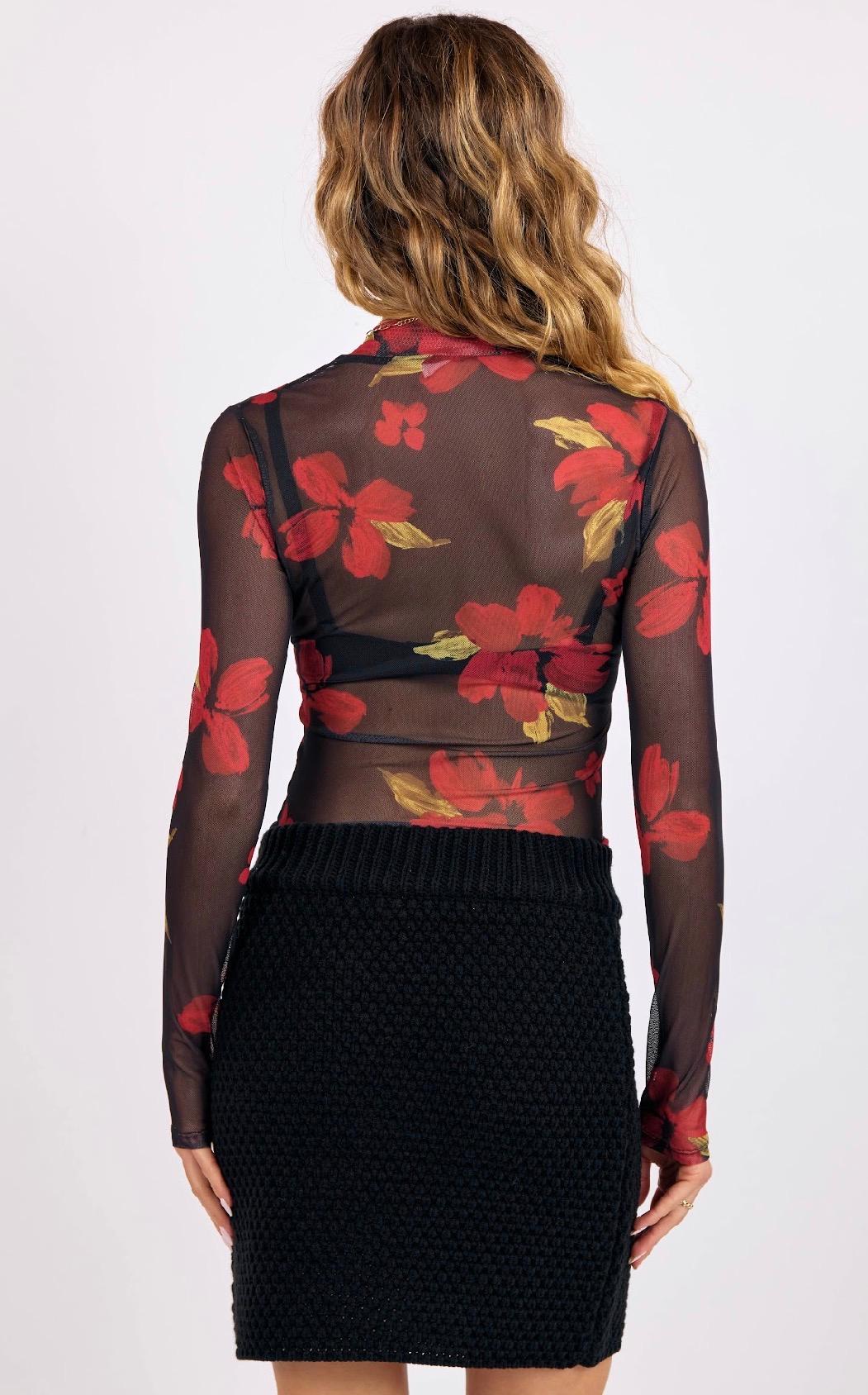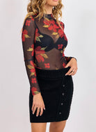 This top is a sheer, lightweight mesh layer featuring a bold red-and-gold floral print that feels both artistic and modern. Its fitted silhouette and mock-neck design make it an effortless statement piece—eye-catching on its own and incredibly versatile for layering. Wear it over a simple cami for added coverage, or use it as a styling piece under sleeveless dresses, jumpsuits, or structured vests to bring depth and interest to your outfit. The long sleeves and smooth stretch mesh keep it comfortable while adding that elevated, fashion-forward touch.