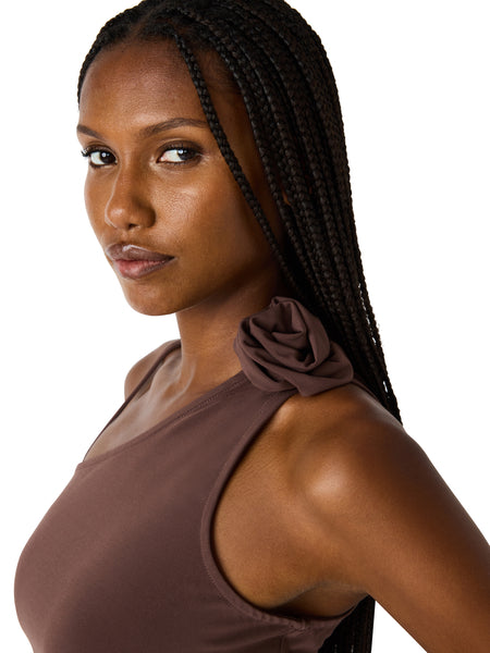 This fitted knit top features an asymmetrical one-shoulder neckline with a delicate strap on one side for a modern, elevated look. Designed in a soft, stretchy fabric, it hugs the body with flattering side ruching that enhances the silhouette. Dimensional rosette details at the shoulder and hip add a feminine, statement finish. Perfect for dressing up denim or pairing with tailored pieces for a chic, polished outfit.