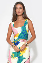 This vibrant cropped top is designed in a bold, artistic print that instantly makes a statement. Featuring a flattering square neckline and wide straps, it offers a clean, structured look with a modern, feminine feel. The silhouette is fitted through the bodice, while the back is finished with a smocked panel that provides comfortable stretch and a flexible fit. Crafted from a lightweight woven fabric, it feels airy and breathable while still holding its shape. The cropped length pairs perfectly with high-waisted bottoms, making it an easy go-to for warm-weather styling or a standout matching set moment with the matching skirt.