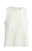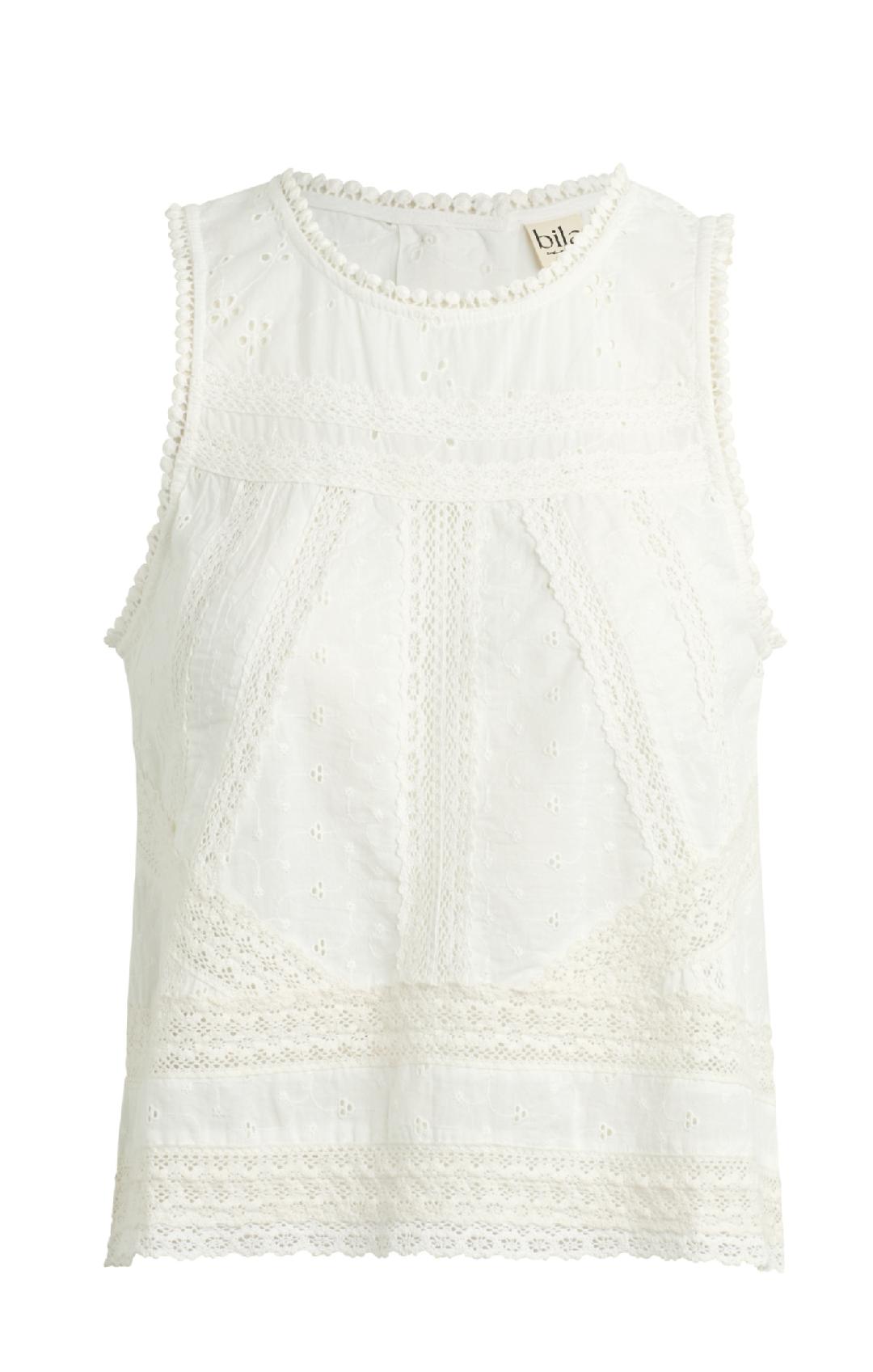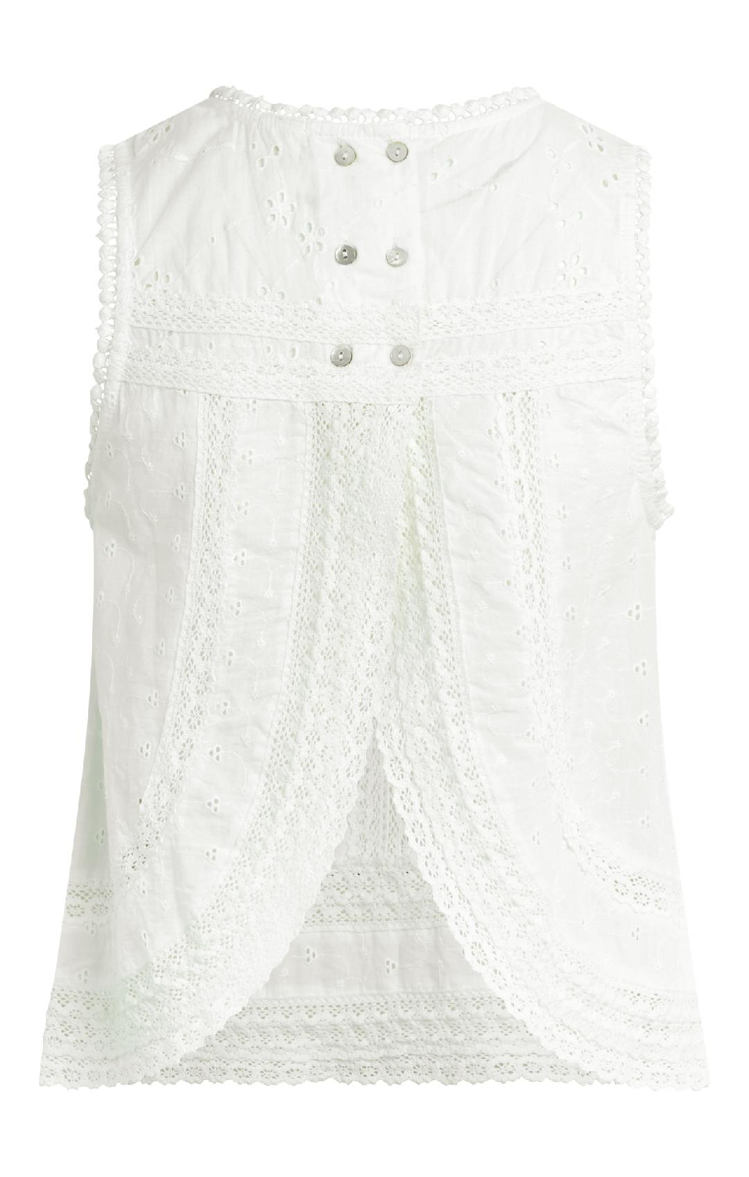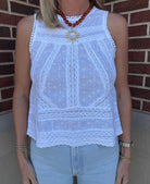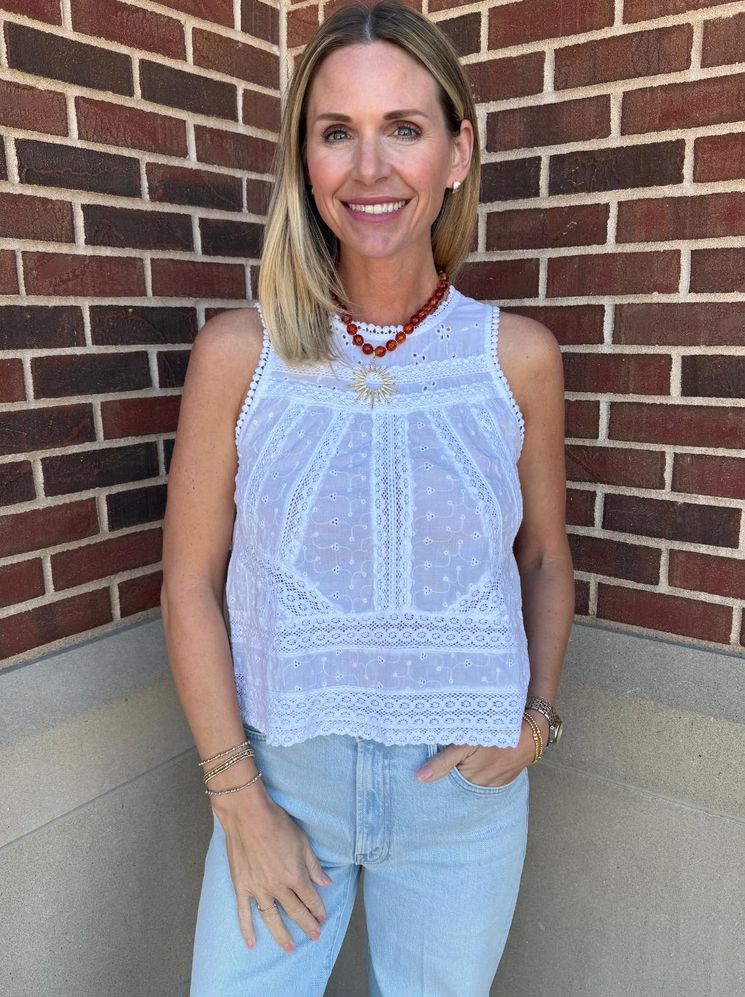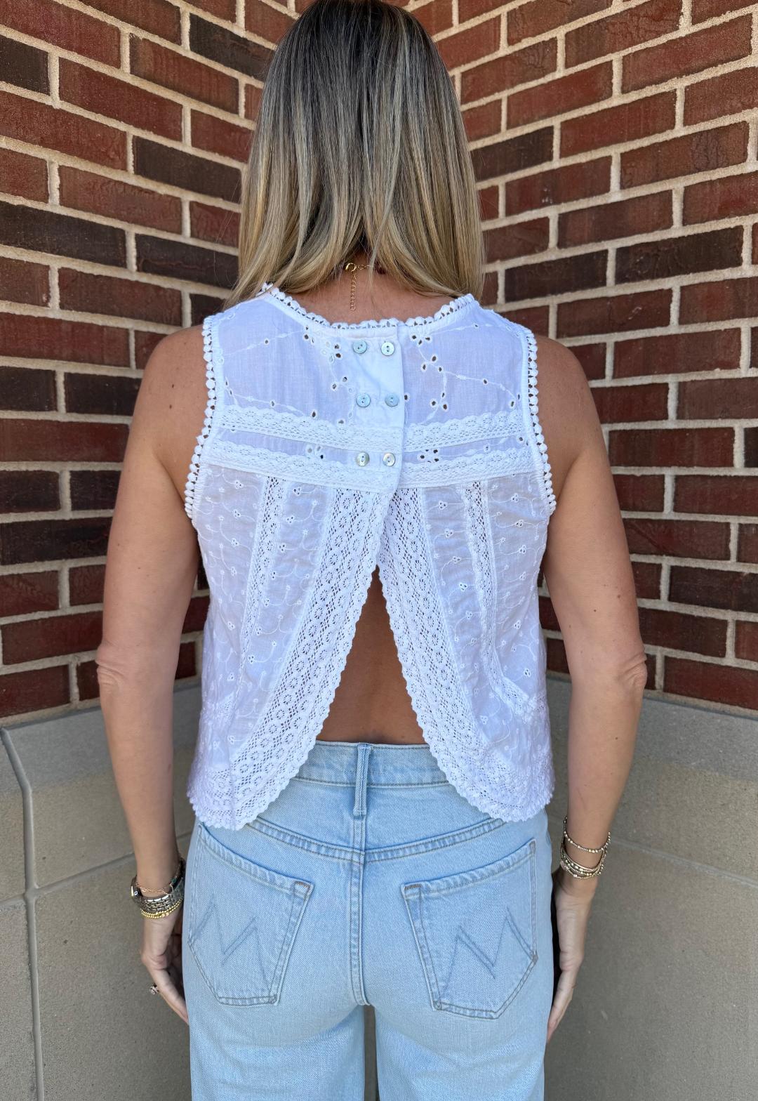 A delicate, feminine top designed with intricate lace and eyelet detailing throughout. This sleeveless style features a high neckline with scalloped trim and beautifully placed lace panels that create texture and dimension across the bodice. The lightweight fabric offers an airy feel, while the slightly relaxed silhouette keeps it easy and effortless. The back is finished with button closures and a subtle open split detail for an unexpected, elevated touch. Perfect for pairing with denim for a soft, polished look.