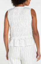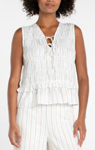 The top is crafted from a lightweight cotton fabric with a soft, breathable feel and subtle texture throughout. Designed with a sleeveless silhouette and a relaxed fit, it features delicate allover smocking that adds dimension while offering comfortable stretch through the body. The neckline has a soft V shape with a functional tie-front detail, giving it a casual, feminine touch. A gently ruffled hem creates a flattering, slightly flared shape that moves easily and adds a bit of playful volume. The fabric is finished with subtle vertical stripe detailing in blue and tan stripes, making it an easy piece to dress up or down. We love it with the matching pant.
