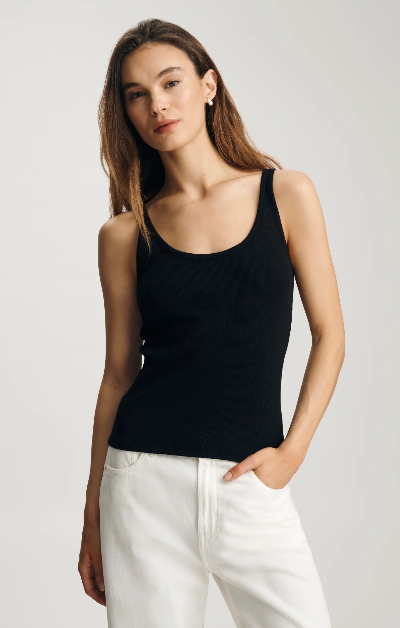 Your favorite scoop neck tank, refreshed with thin straps and a ribbed knit texture. The fitted but stretchy silhouette pairs perfectly with denim or layers under a button-up for casual summer style. A closet essential!