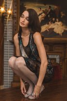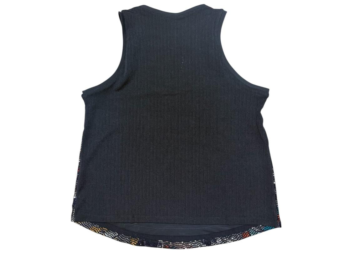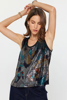 A striking sleeveless top featuring a vibrant mosaic of metallic foiled dots in teal, bronze, gold, silver and black hues. Designed with a relaxed, easy fit and scoop neckline, this tank captures light from every angle while maintaining a modern, artistic edge. Finished with black ribbed trim at the neckline, armholes and back for contrast, it’s perfect solo with denim or layered under the matching cardigan with the matching skirt for a bold statement look.