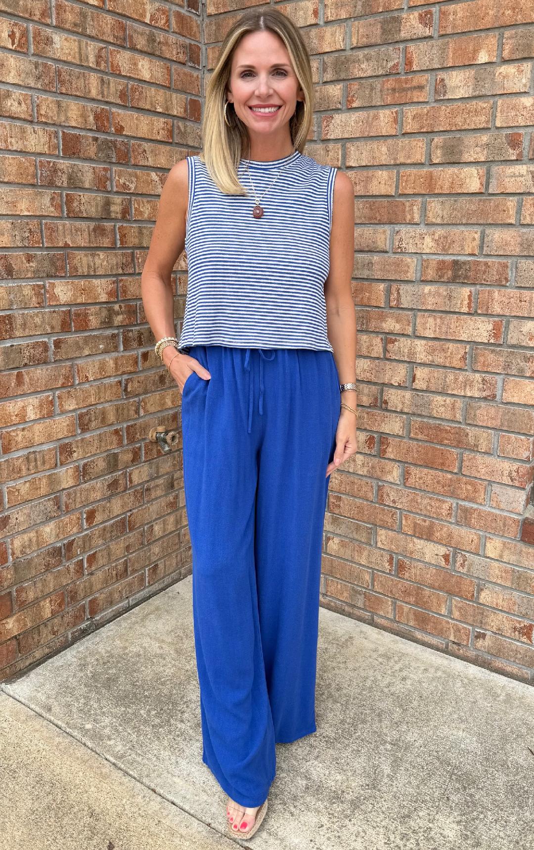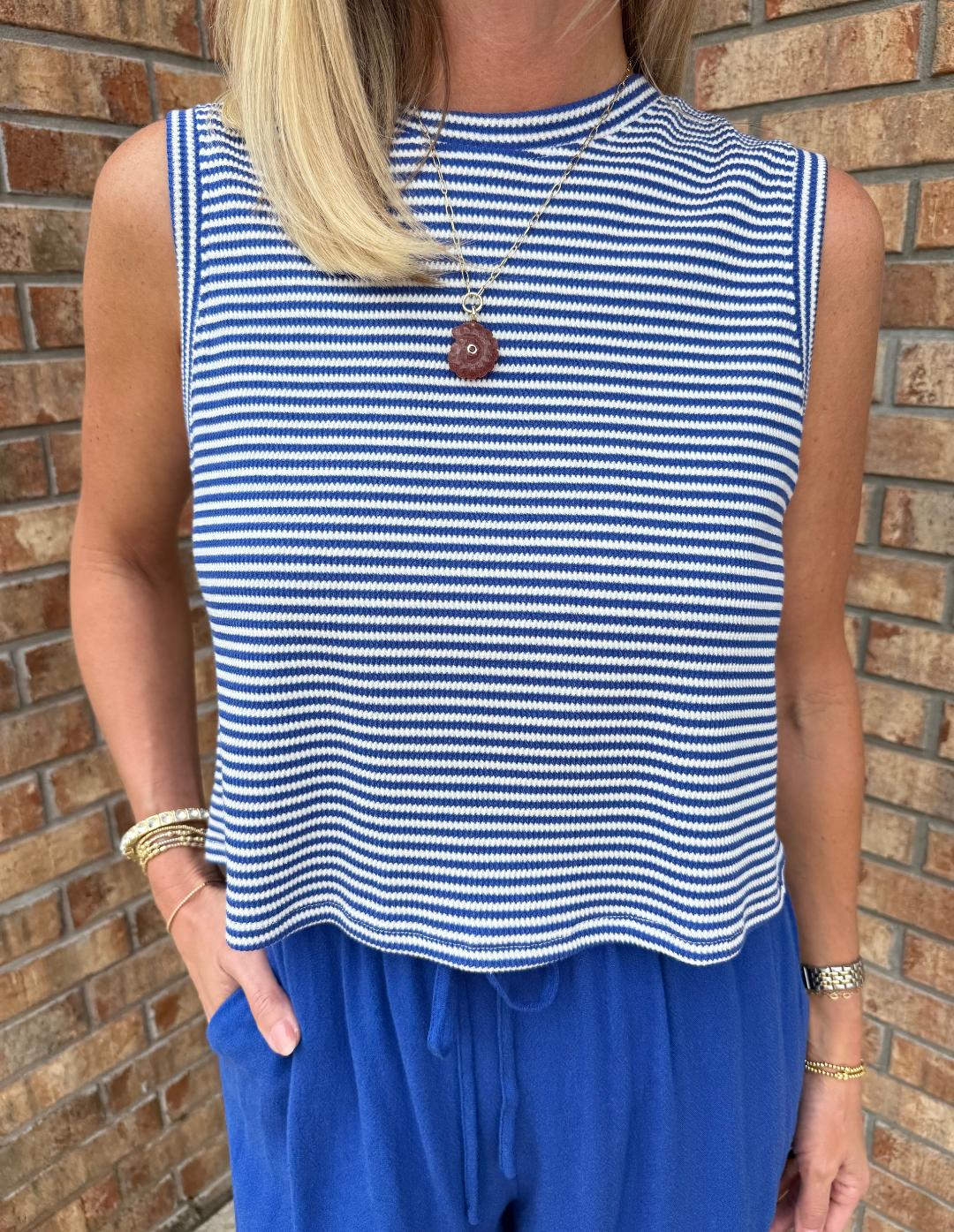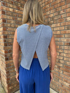 This Palma Overlap Back Top features a chic, nautical-inspired silhouette with a modern twist that brings a fresh, coastal energy to your wardrobe. The classic striped pattern and unique open-back detail create a breezy, elevated look perfect for seaside afternoons. Style with white denim or the cobalt blue Sugarloaf Pant.