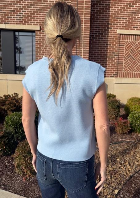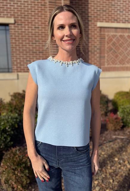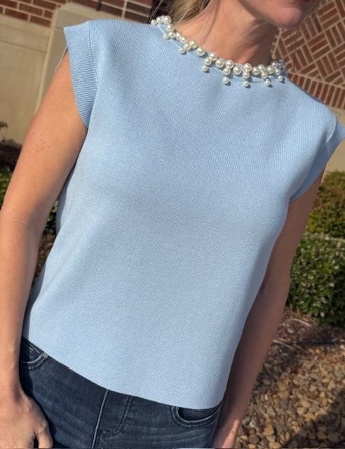 This polished knit top blends soft structure with delicate detail an effortlessly elevated look. Designed in a serene powder blue hue, it features a smooth, lightweight knit with a clean, tailored silhouette. The sleeveless cut is balanced by subtle shoulder shaping, giving it a refined finish without feeling stiff. Pearl embellishments along the neckline adds a touch of elegance, making this piece easy to dress up or down. Perfect with denim for daytime or styled with trousers or a skirt for evenings and special occasions, this top brings timeless charm to any wardrobe.