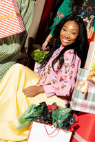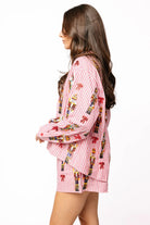 This Queen of Sparkles Red Stripe Scattered Nutcracker and Bow Cotton Button-Up is a structured shirt featuring a red and white vertical stripe pattern. It is constructed from 100% cotton, offering a crisp yet comfortable fit. The design includes sequin and embroidery embellished nutcracker and bow motifs arranged across the front, back, and sleeves, adding a distinct holiday aesthetic. The shirt is detailed with a traditional point collar, button-front closure, and long sleeves with buttoned cuffs. Its slightly relaxed silhouette allows for styling versatility, suitable for pairing with leather shorts, denim, or festive skirts for coordinated seasonal wear. (we do not sell the shorts)