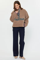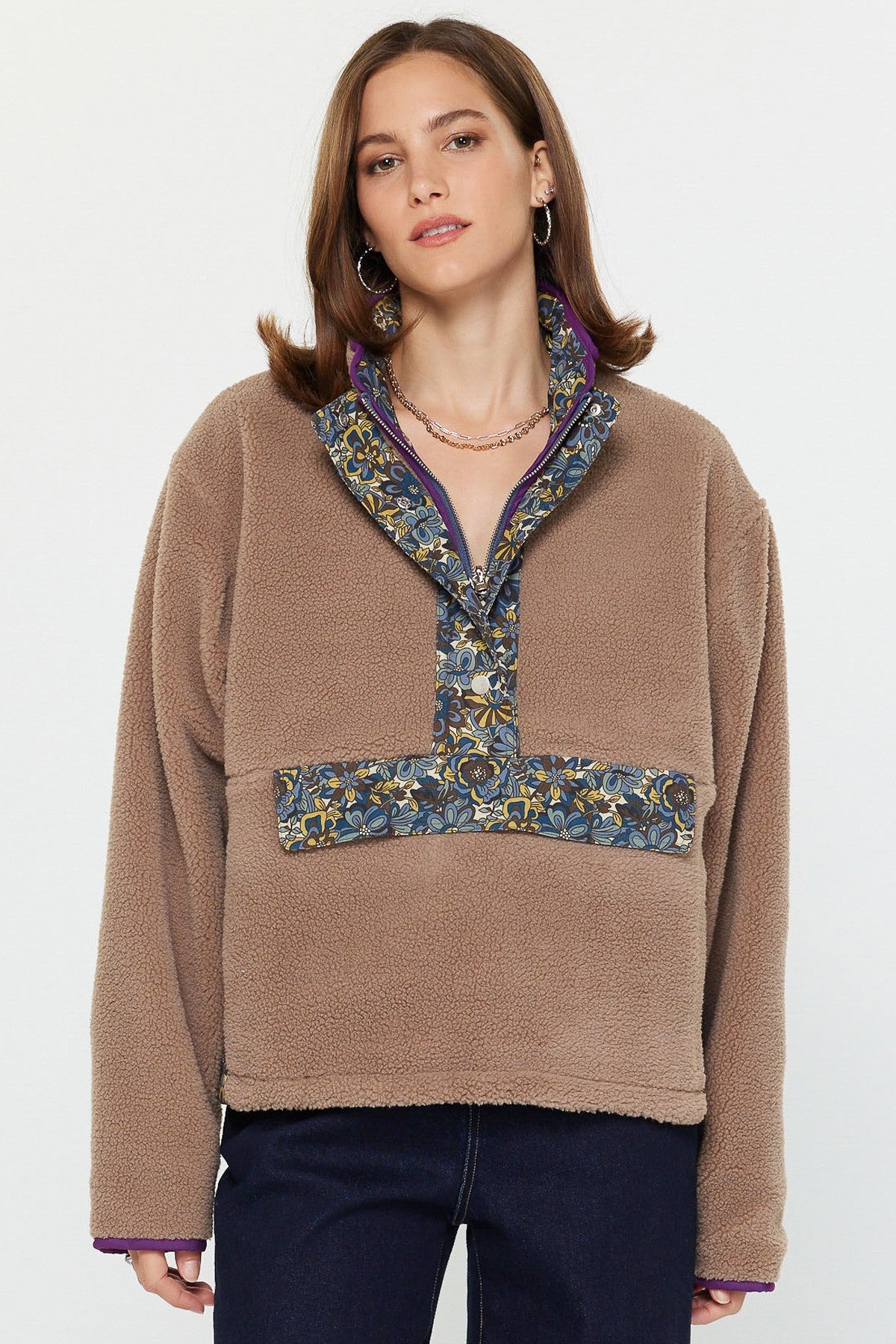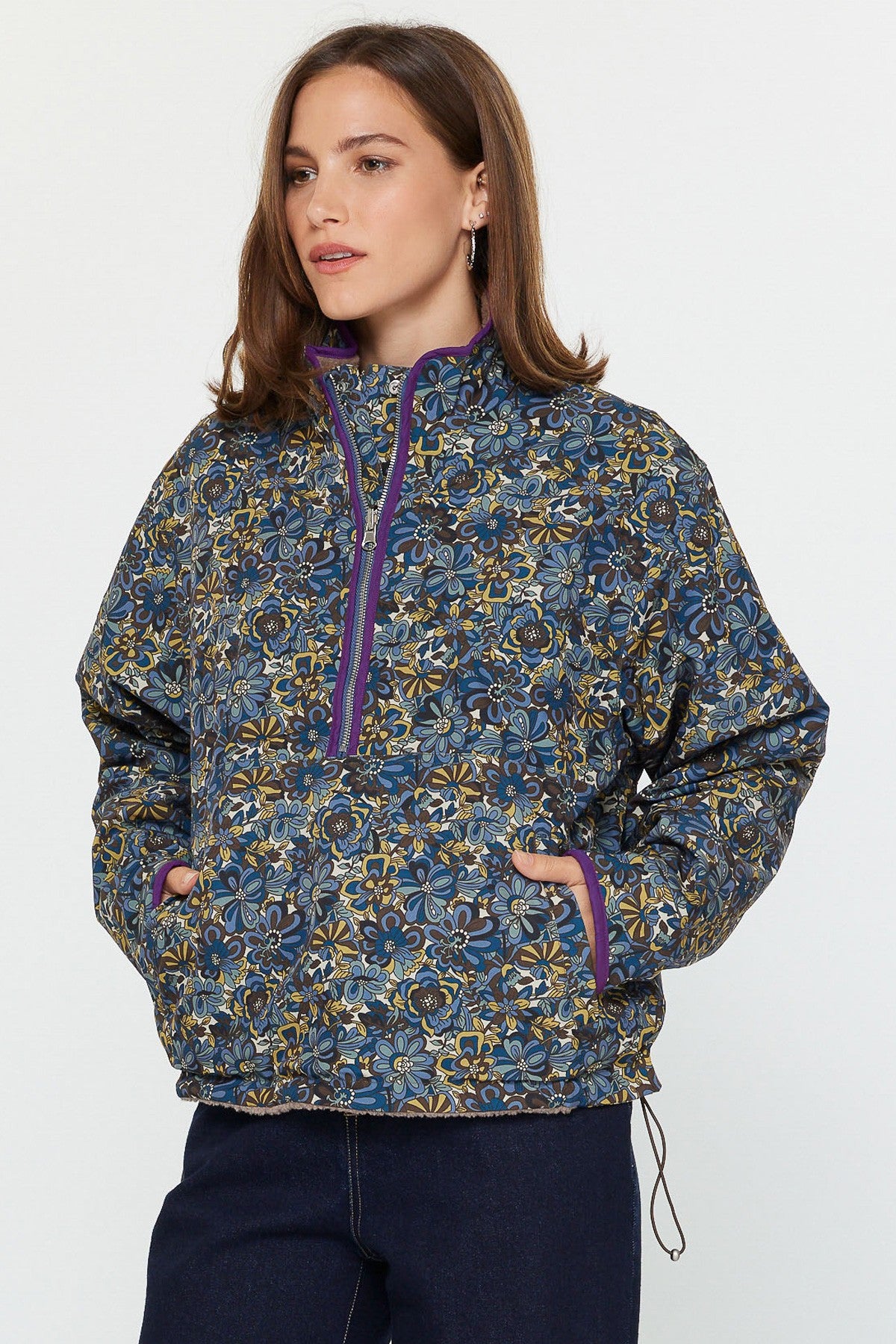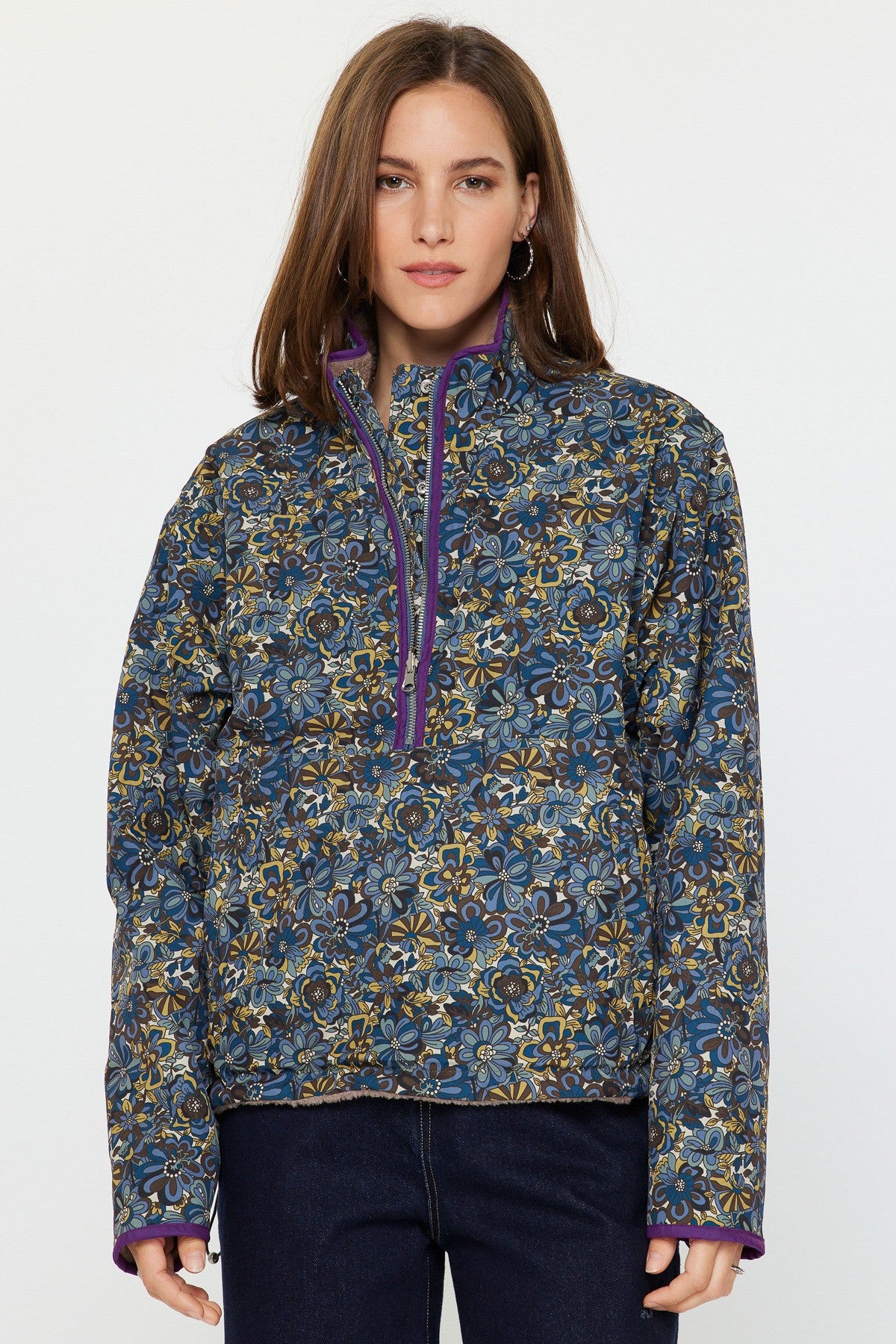 This reversible pullover is the perfect blend of cozy and cool-weather style. One side features a plush taupe fleece that’s incredibly soft and warm, while the reverse side reveals a vintage-inspired floral print in rich tones of blue, gold, and brown. A contrasting purple zipper and trim add a fun pop of color. Designed with a relaxed fit, quarter-zip neckline, and kangaroo pocket, this pullover also includes an adjustable drawcord at the hem to customize the fit and seal in warmth. Whether you wear it print-side out for a bold look or fleece-side out for laid-back comfort, it’s a statement piece that combines function, texture, and versatility effortlessly.