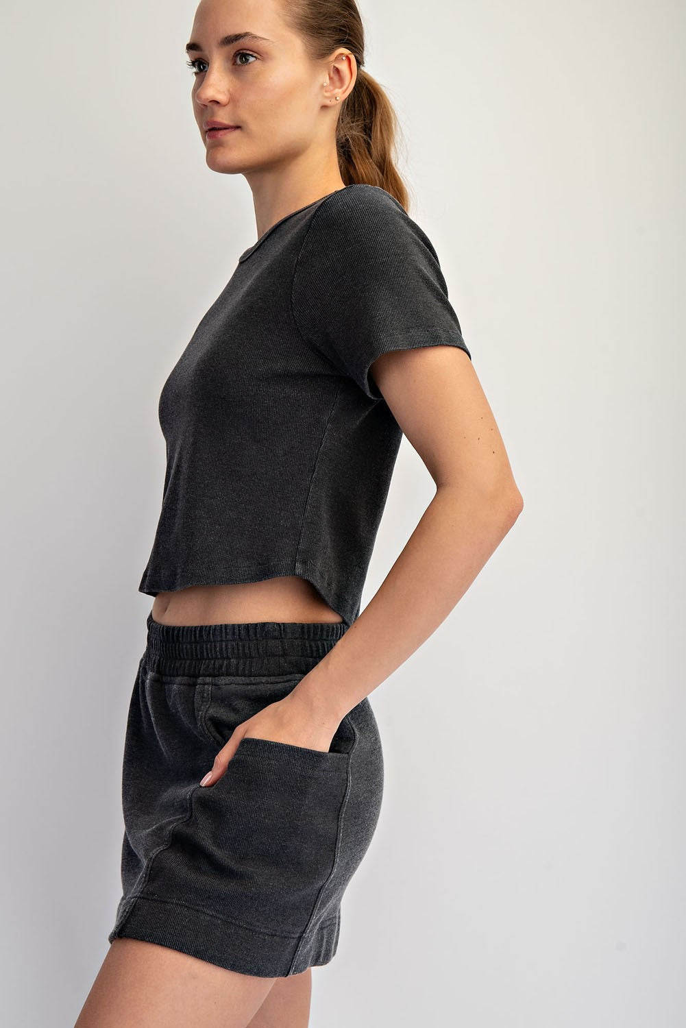 Crafted from mineral-washed rib cotton, this tee brings a soft, breathable feel with an easy, everyday attitude. The standard fit and clean crew-neck shape keep it timeless, while the mid-to-slightly-cropped length adds just the right touch of modern ease. Simple, versatile, and effortlessly stylish - the kind of top that blends into any look without ever feeling basic. Style with the coordinating skort for a casual look or any of your denim.