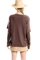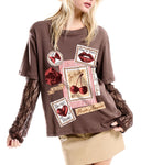 This layered tee blends casual comfort with a romantic, vintage-inspired edge. Crafted in a soft, lightweight cotton with a standard fit, it features an attached lace long-sleeve layer that adds texture and dimension without the bulk of true layering. The mixed graphic collage on the front brings a nostalgic, Valentine-inspired feel with subtle pops of color and charm. Easy to style and effortlessly cool, this tee pairs perfectly with denim, skirts, or tailored bottoms for a look that feels both laid-back and thoughtfully styled.