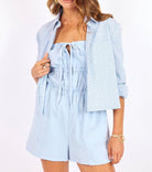 This seersucker textured button-up is the ultimate lightweight layering piece or solo for spring and summer. Designed in a soft sky-blue micro plaid with classic puckered seersucker texture, it has that effortless, breathable feel that keeps you cool while still looking polished. The relaxed, slightly cropped silhouette makes it easy to throw on over a tank, romper, or dress. It features a traditional collar and button-front styling, but the real standout detail is the open back slit with adjustable tie closure — adding an unexpected, feminine touch and a little movement from behind. Rolled sleeves keep it casual and versatile, whether worn open as a layering piece or buttoned up for a more tailored look. Easy, coastal-inspired, and perfect for warm-weather styling.