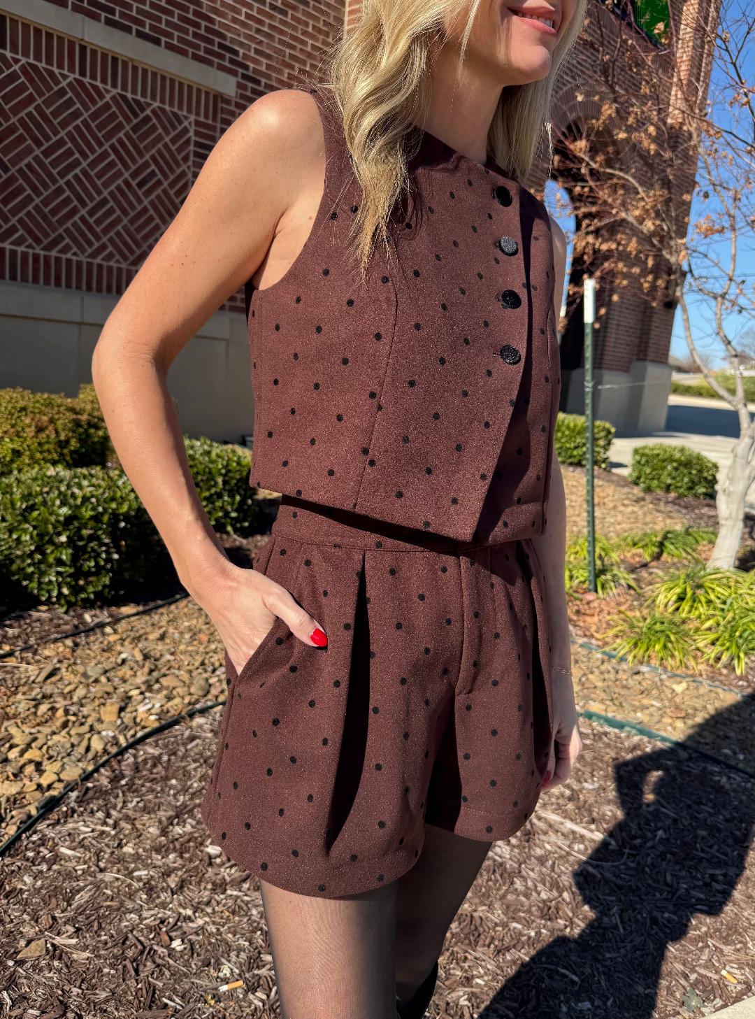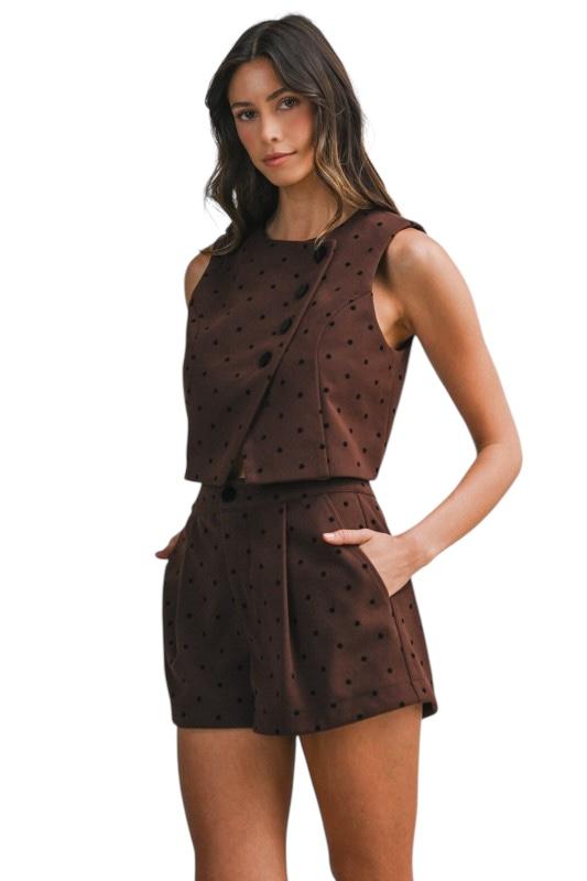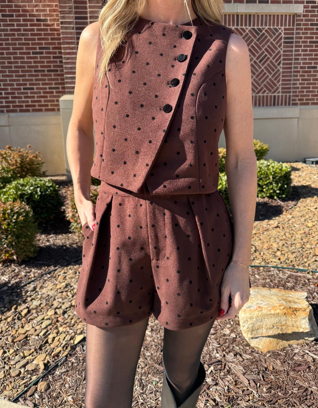 This rich chocolate brown two-piece set is all about elevated texture and timeless charm. Designed in a soft velvety fabric with subtle black polka dots, the sleeveless vest features a clean, tailored silhouette with an asymmetrical front and decorative buttons for a refined finish. The coordinating shorts sit high at the waist with gentle pleating and a relaxed shape that balances structure with ease. Together, they create a chic, statement-making set that feels both classic and modern. Wear them styled together for a polished look, or mix and match each piece with denim, knits, or boots for versatile fall-to-spring styling. SOLD AS A SET>