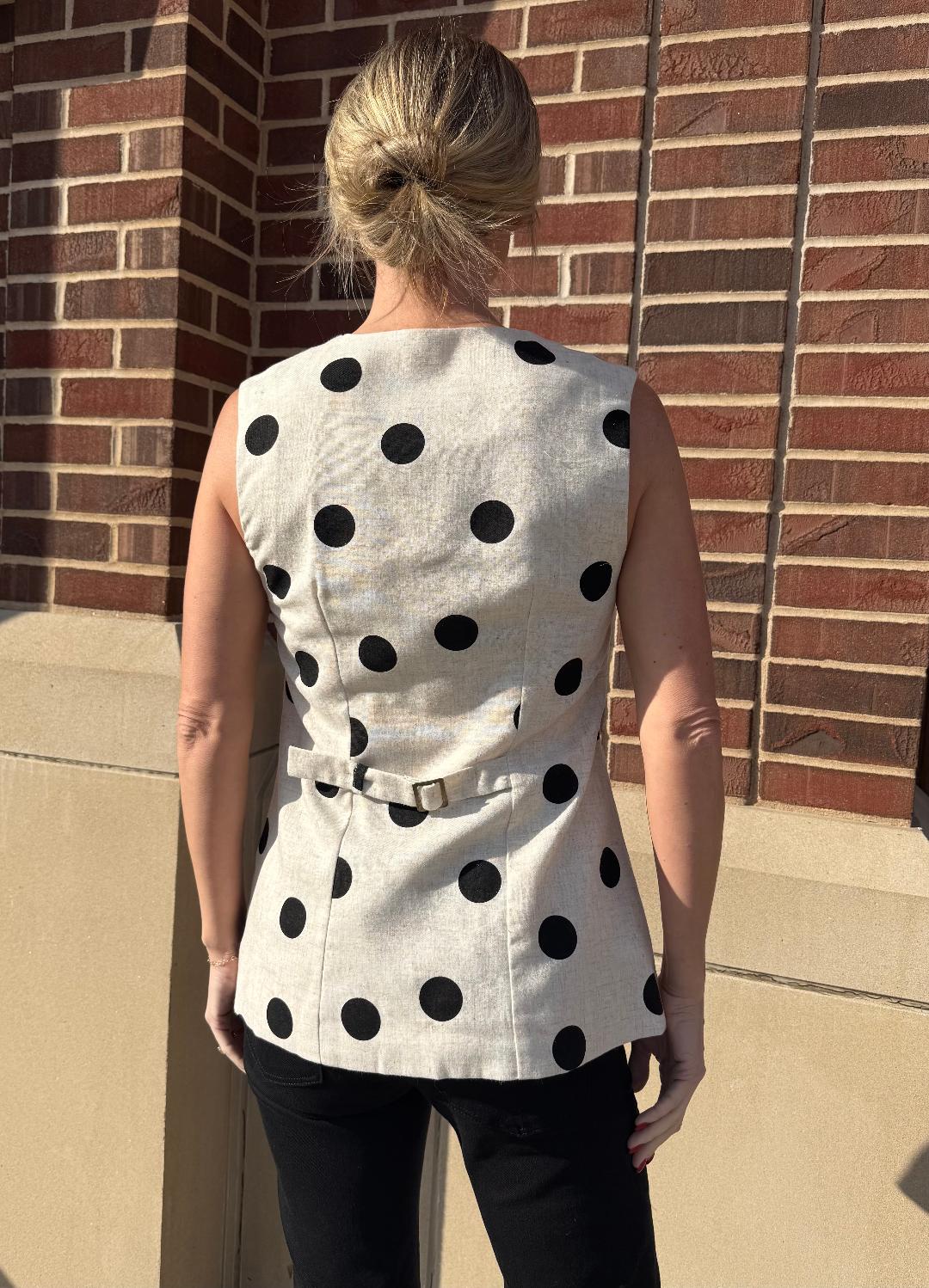 This sleeveless linen-blend vest top features a timeless black polka dot print on a natural neutral base. Designed with a tailored silhouette, it has a round neckline, full button-front closure, and subtle seaming for a flattering, structured fit. The curved hem adds shape and femininity, while the front pocket flaps are non-functioning and purely decorative for a polished finish. Finished with an adjustable back belt for a customizable fit, this piece styles beautifully on its own or layered over a fitted tee or blouse.
