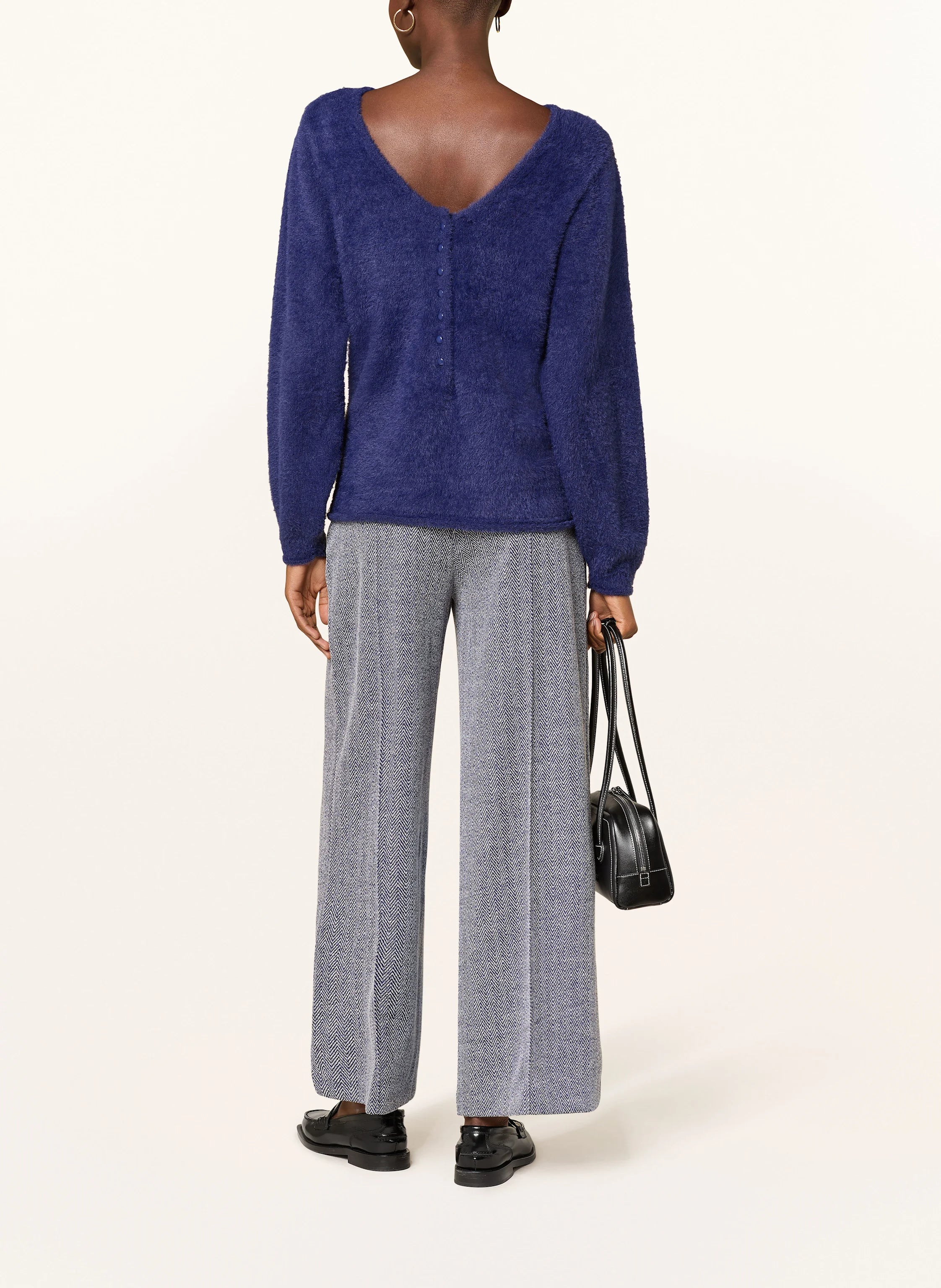 This super soft furry sweater is the definition of cozy-meets-chic. Crafted in a plush, textured knit, it has a luxuriously fuzzy feel that’s lightweight yet warm, making it the perfect transitional piece. Designed in a rich blue hue, it features a versatile reversible neckline—you can wear it with the classic scoop in front or flip it around for a feminine deep-V back with delicate button detailing. The relaxed silhouette and long sleeves give it an effortless drape that pairs beautifully with everything from tailored trousers to skirts or denim.