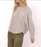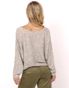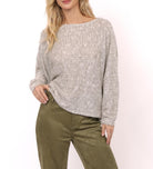 This top is a lightweight knit pullover with an effortlessly relaxed fit. The fabric features a subtle textured weave in a soft olive and cream mix, giving it a cozy yet breathable feel. Designed with dolman sleeves and a slightly slouchy silhouette, it drapes beautifully on the body for an easy, laid-back look. The wide neckline allows for versatile styling—wear it slightly off one shoulder for a casual vibe or keep it centered for a classic fit. The hem hits at the hip, making it perfect for pairing with both high-waisted trousers or casual denim. A great transition piece that balances comfort and style, this knit is ideal for layering or wearing on its own.