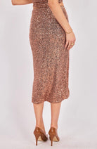 This skirt is a dazzling copper sequin midi designed to shine from every angle. Fully covered in shimmering sequins, it catches the light beautifully while still offering a smooth, body-skimming fit. The high-rise waist creates a flattering silhouette, and the midi length keeps it elegant and sophisticated—perfect for holiday parties, winter weddings, or any occasion that calls for sparkle. It also has a matching top, making it easy to style as a coordinated set for a true statement look. Pair it with the matching piece for full glam or mix it with a simple sweater or silky cami for a chic, balanced outfit.