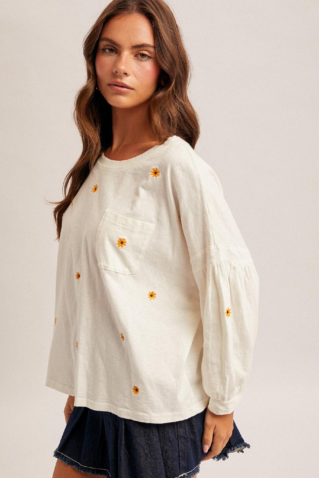 This top is soft, sweet, and effortlessly feminine with just the right amount of charm. Crafted in a lightweight cream cotton, this relaxed-fit blouse features delicate scattered daisy embroidery in warm golden tones throughout. The subtle floral detailing adds texture and interest without overpowering the look, making it an easy everyday piece that still feels special. Designed with a classic round neckline and a front chest pocket, it has a laid-back silhouette that drapes beautifully. The sleeves are finished with a gentle gathered detail that creates a soft balloon shape, adding a feminine touch to the otherwise simple cut.