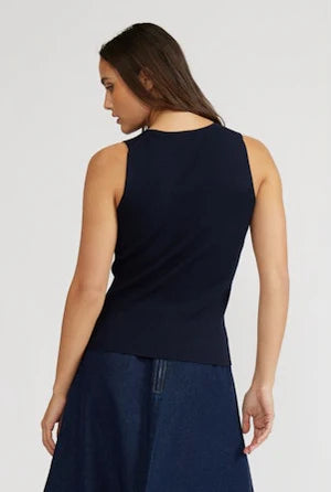 This is a sleek navy ribbed knit top in a nice, medium weight designed with a sleeveless silhouette and a flattering V-neckline. The fitted shape emphasizes the waist, while the ribbed texture adds subtle dimension to the look. Down the front, hammered gold buttons provide a chic, elevated detail that contrasts beautifully with the deep navy tone. Its versatile design makes it easy to pair with skirts, trousers, or denim for both casual and polished outfits. Wear alone or style over a blouse or collared shirt.