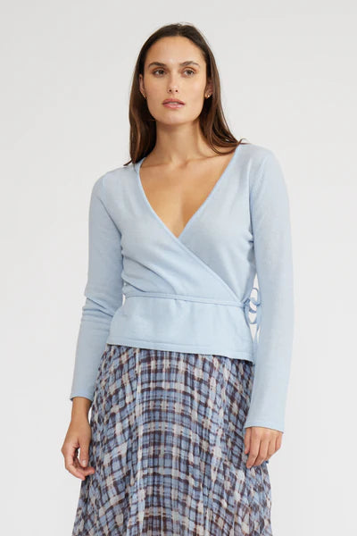 This top is a soft and lightweight knit in a dreamy baby blue shade, designed in a wrap silhouette that creates a flattering, feminine shape. The deep V-neckline adds a touch of sophistication, while the long sleeves keep it versatile for year-round wear. A slim tie self tie accentuates the waist and gives it a subtle, tailored finish. Its slightly fitted cut pairs effortlessly with skirts, denim, or tailored pants, making it a chic option for both casual and dressier occasions. Styled here with our Talia Plaid Pleated Midi Skirt.