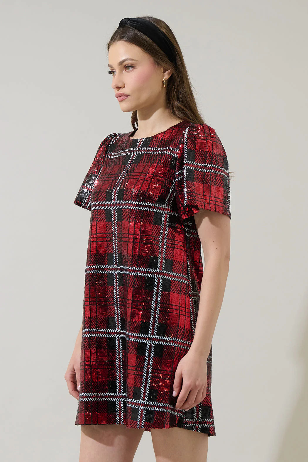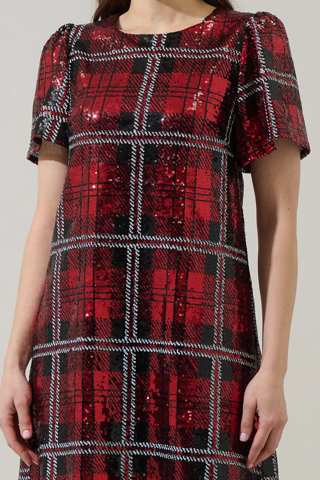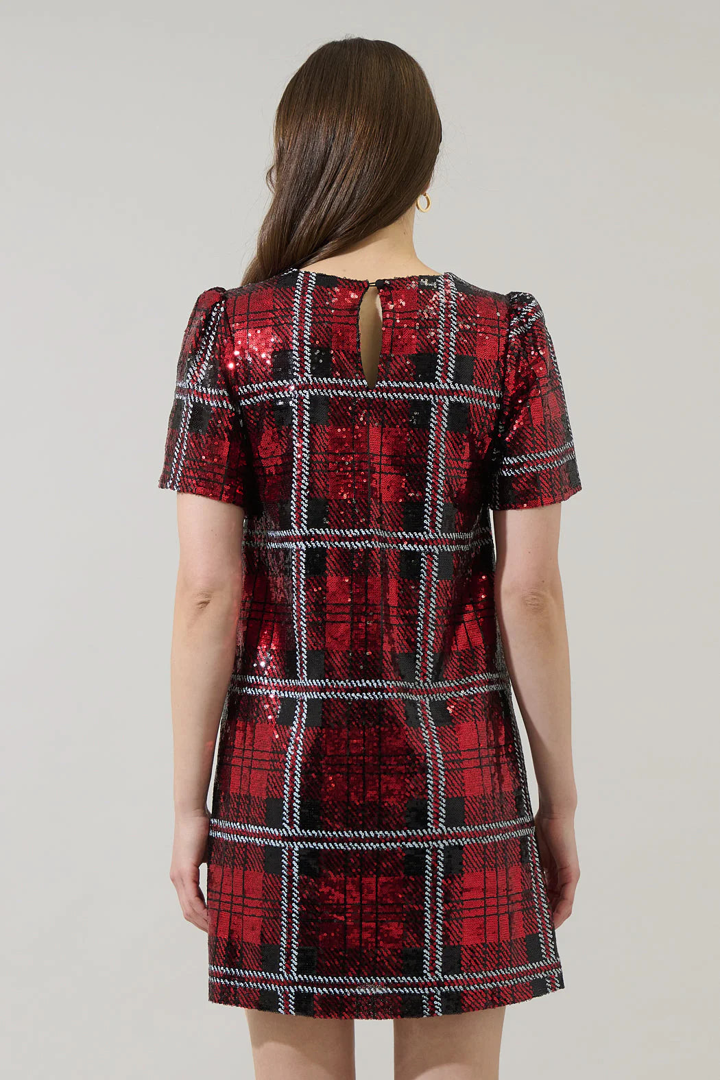 This mini dress is holiday glamour wrapped in classic plaid. Covered in shimmering sequins from top to hem, it transforms traditional red tartan into a full festive sparkle moment. The structured plaid design shines through beautifully, giving you that perfect balance of timeless pattern and eye-catching shine. The silhouette is simple and chic—a straight, easy fit with short sleeves, a round neckline, and a subtle keyhole back closure. Lightweight movement and a comfortable shift shape make it effortless to wear from cocktail hours to Christmas parties and New Year’s celebrations. Pair it with black heels and statement earrings for a look that’s joyful, bold, and completely unforgettable. This is your go-to holiday party dress when you want maximum sparkle with zero fuss.