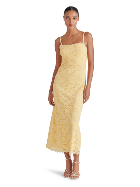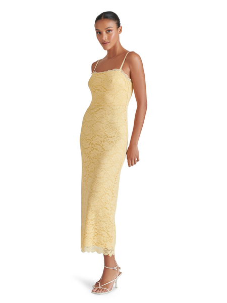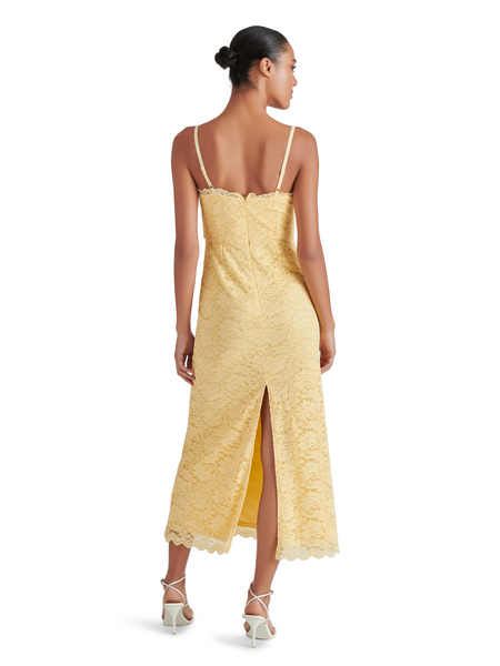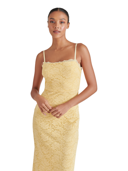 Radiate a golden glow when you wear this beautiful lace, body-skimming dress. The stretchy fabric is comfortable and the slit on the back allows for easy movement. A perfect dress for Spring/Summer special occasions!