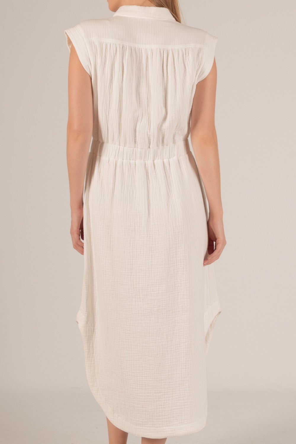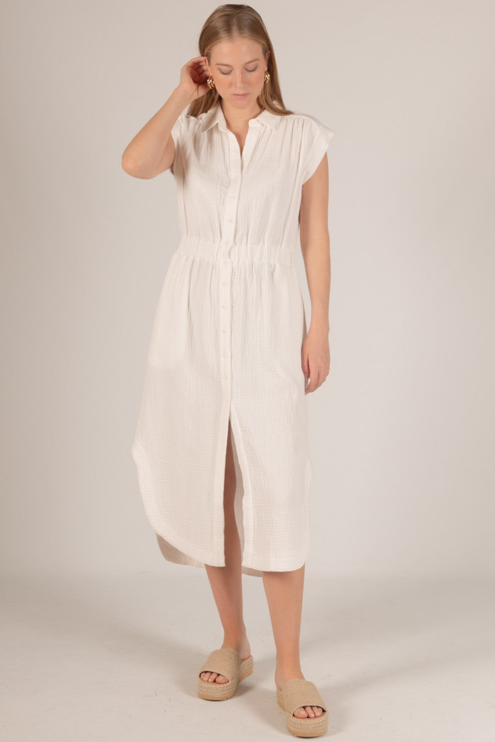 A white, breezy gauze dress...the epitome of Spring and Summer. This figure-flattering midi features an elastic waistline and classic button front design. Style with sneakers or heels as this dress will take you anywhere you need to go.