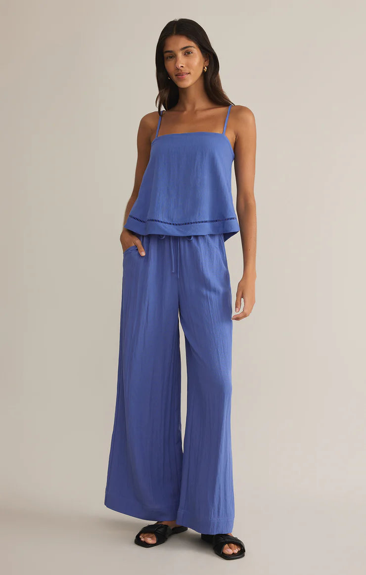Lightweight and airy, this square-neck sleeveless tank features a built-in bra, adjustable spaghetti straps and delicate lattice trim at the hem. The textured rayon fabric and cropped silhouette make it a warm-weather must-have. This gorgeous "riviera blue" will complement any skin tone! Get the matching pant for a chic set.