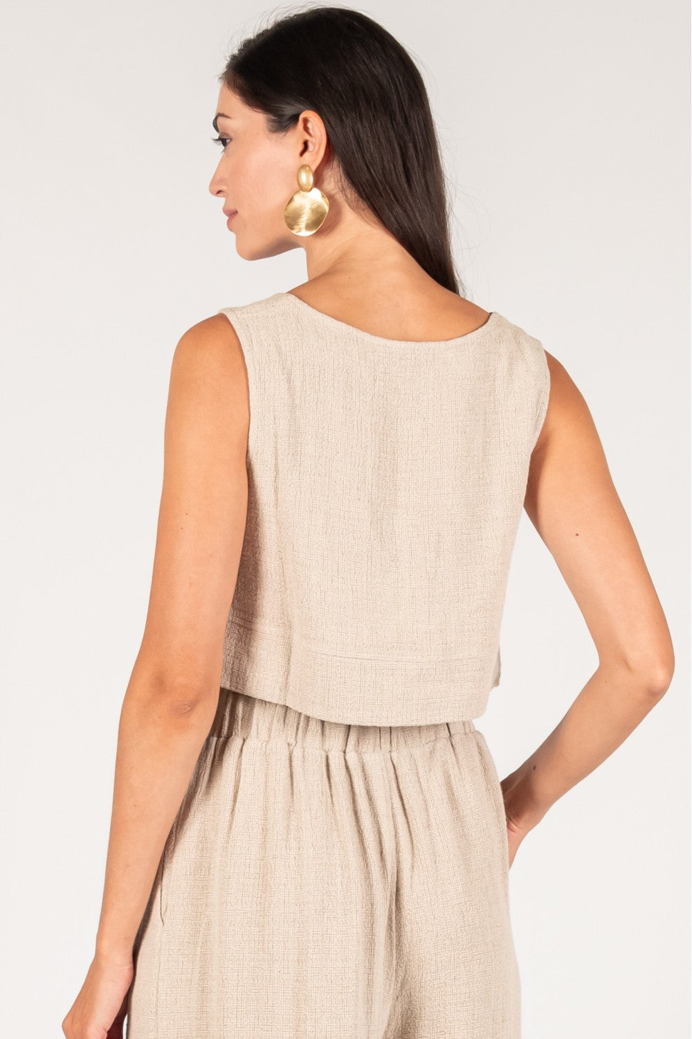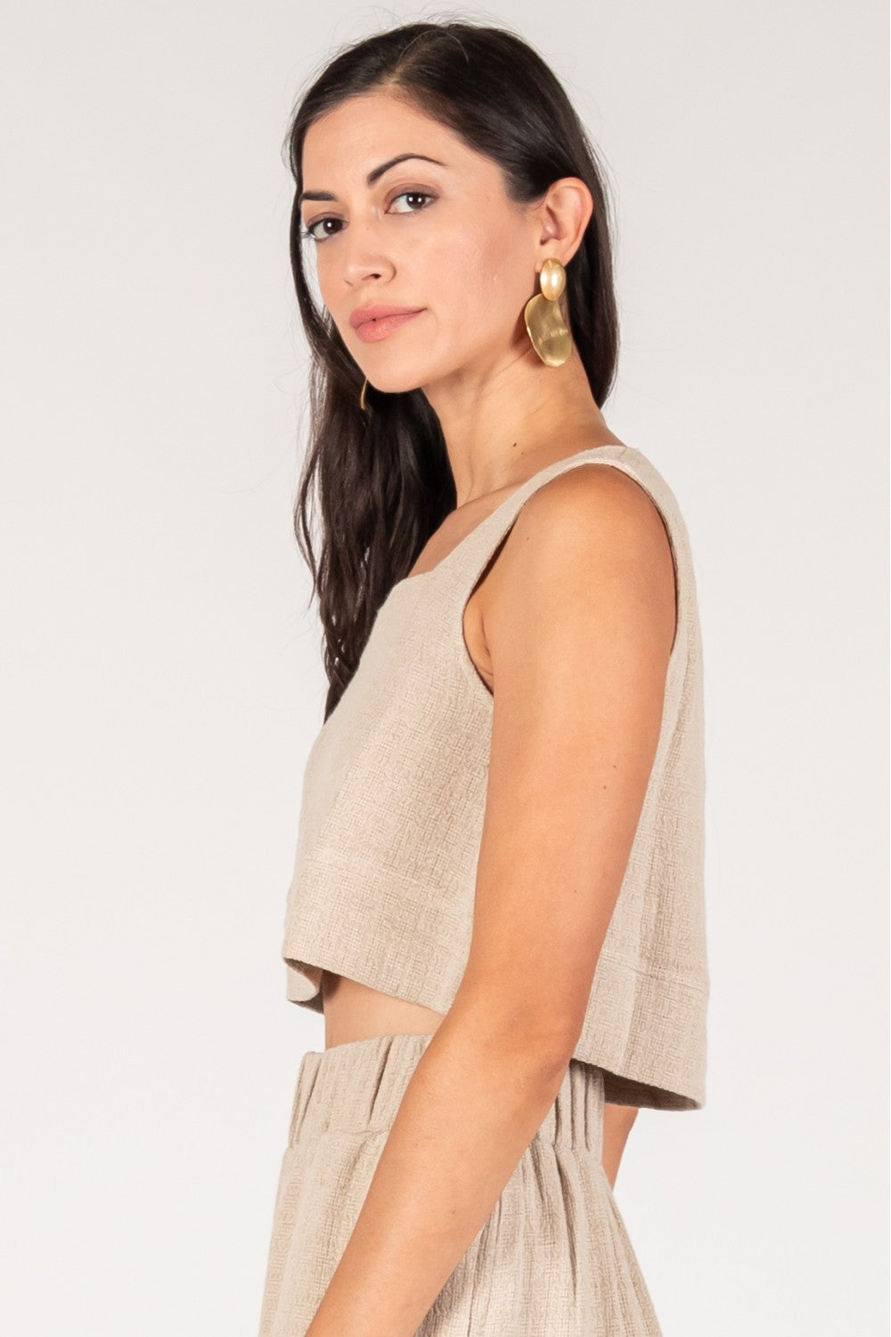 The perfect top for warm summer days. We love it styled with high rise denim, maxi skirt or the pants and shorts made of the same woven, checkered fabric. (NOTE: the top is not the exact color match to the bottoms - it's a slightly lighter sand color).