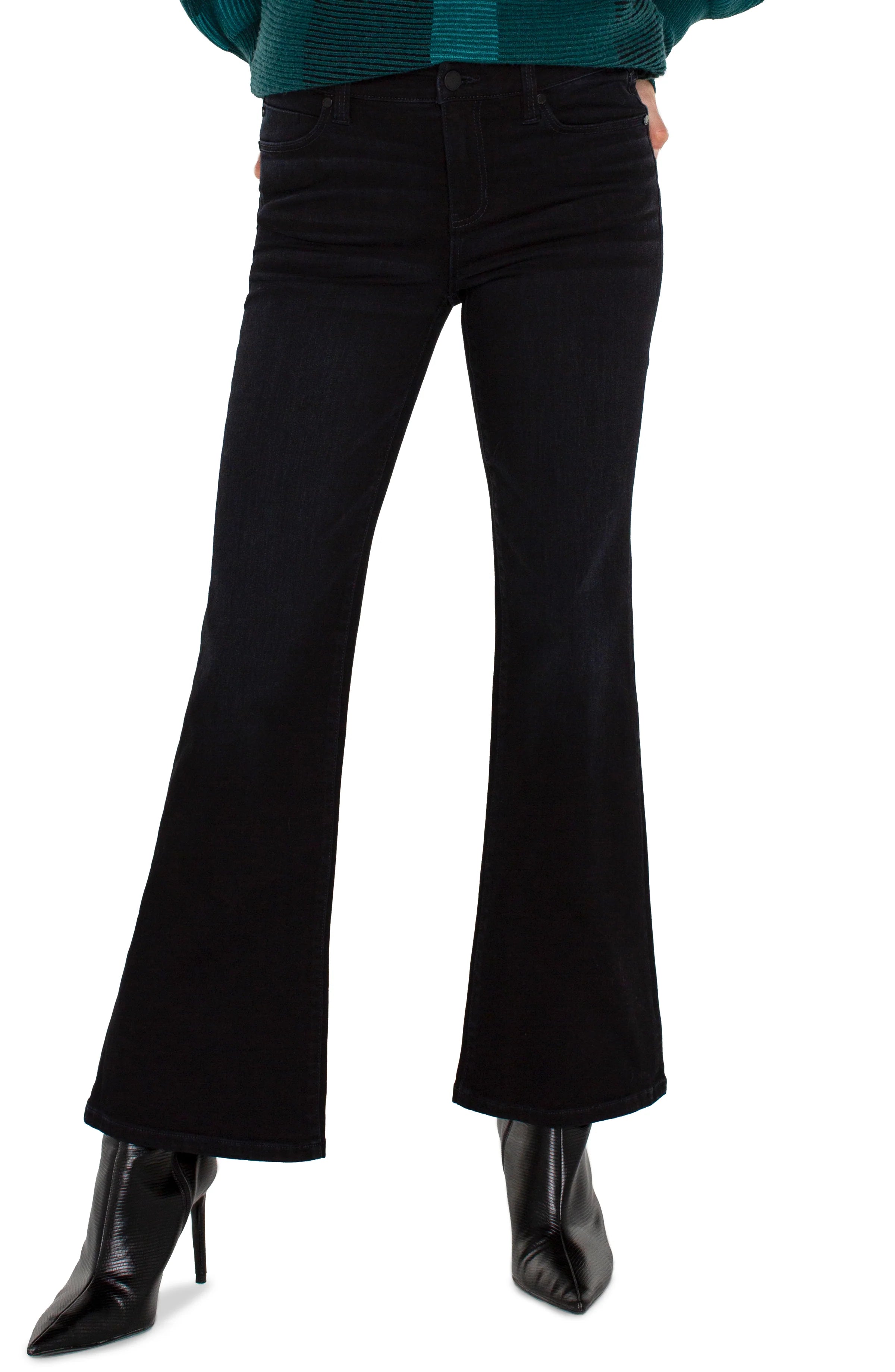 Enhanced your wardrobe in these full length Hannah Flares! A classic style that features a fitted waist and hips with a gradual flare from the knee down. They offer a timeless yet on-trend option for any wardrobe. Pair them with your favorite blouse and boots for a classic look. This black denim is a must!