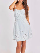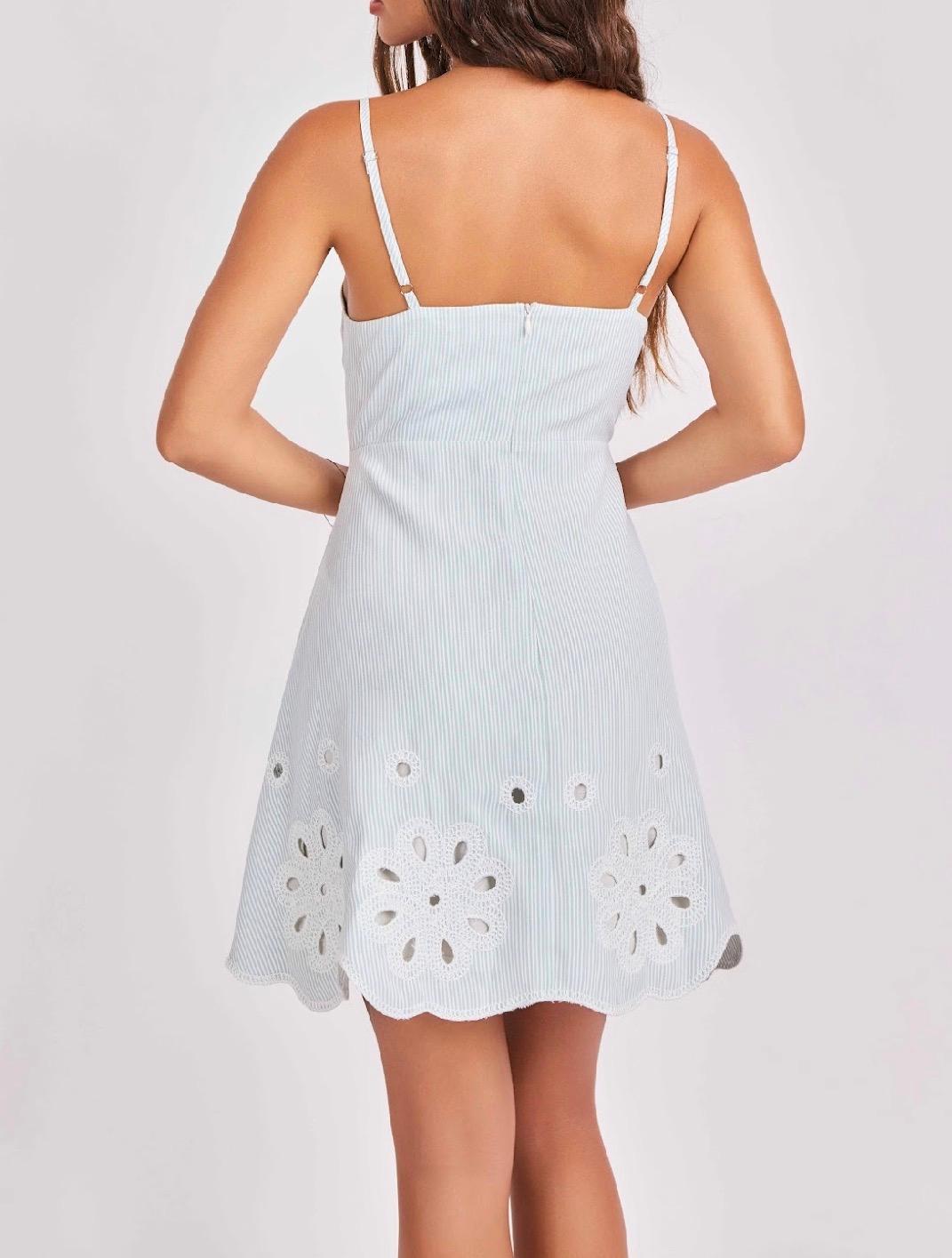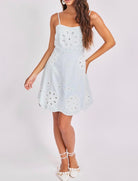 A feminine, flirty mini dress with a soft, structured feel and delicate detailing throughout. Designed with a fitted bodice and subtle A-line skirt, it features adjustable spaghetti straps and a clean back zip closure for an easy, flattering fit. The eyelet floral design is layered over a lining, adding dimension and texture while keeping it fully wearable. The bodice showcases a subtle striped pattern beneath the eyelet, while the skirt transitions to a soft ivory base, creating a beautiful contrast. Finished with a scalloped hemline and intricate cutout details, it’s the perfect blend of sweet and polished for any occasion.