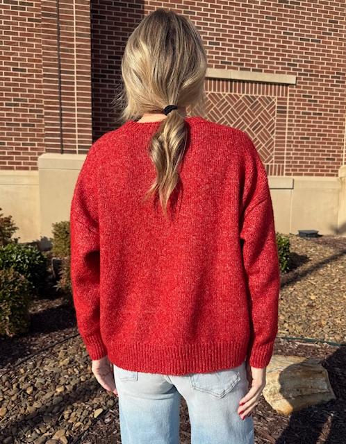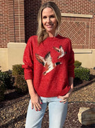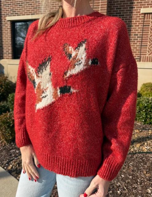 This cozy knit sweater brings a touch of outdoorsy charm to a classic cold-weather staple. Designed in a rich, heathered red tone, it features an intarsia-style mallard motif across the front that adds character without feeling over the top. The relaxed fit and soft knit make it easy to wear, while ribbed trim at the neckline, cuffs, and hem gives it a clean, finished look. Comfortable yet eye-catching, this sweater pairs perfectly with denim for casual days and is ideal for fall and winter outings, whether you’re heading to a weekend brunch or enjoying time outdoors.