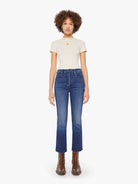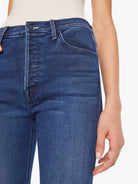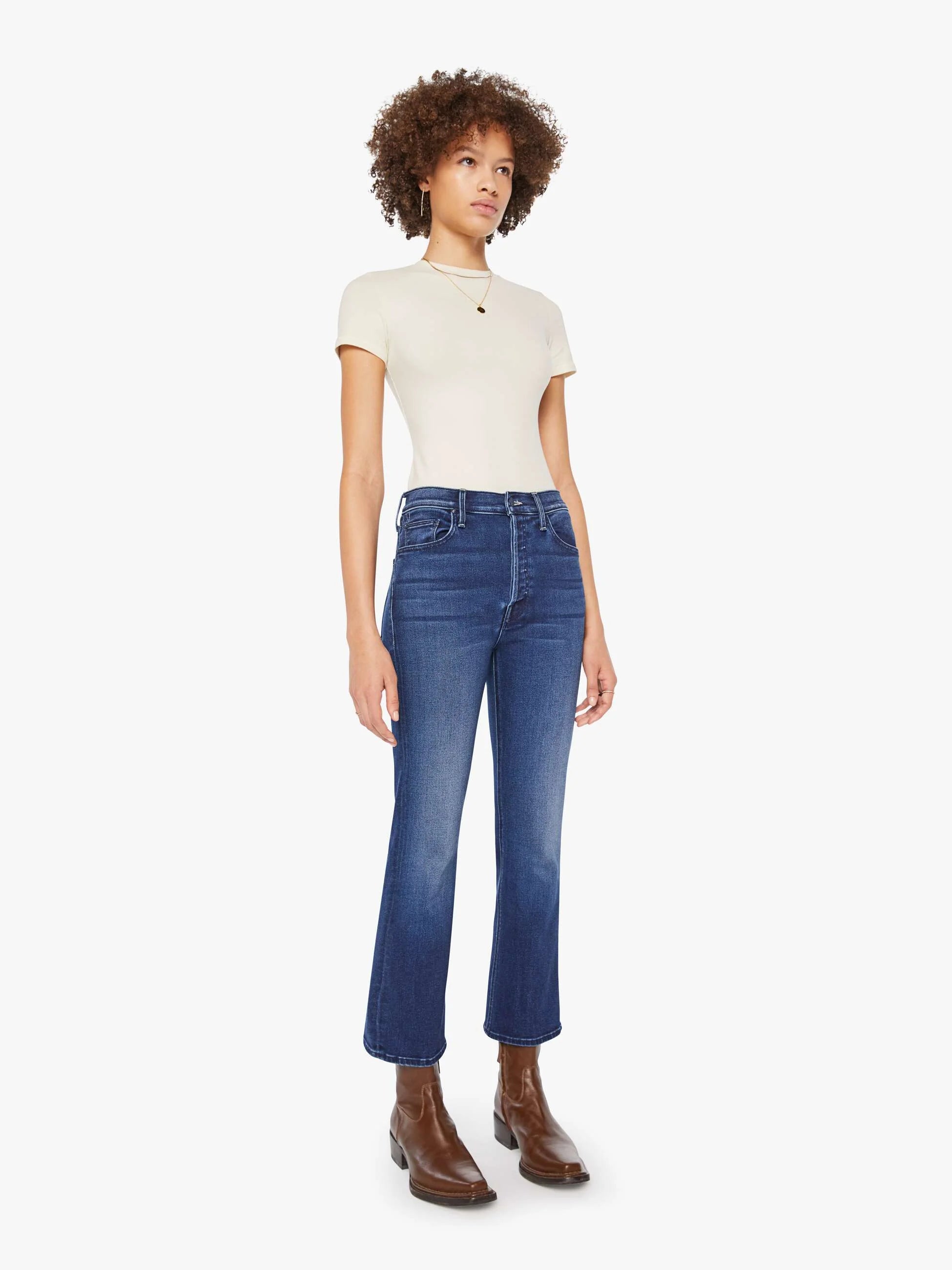 Team spirit. A high-rise flare with a button fly and a clean ankle-length hem. Made from stretch denim, Homecoming High is a dark blue with subtle whiskering and fading at the knees.