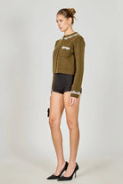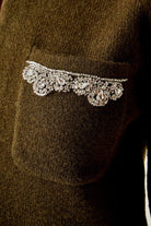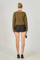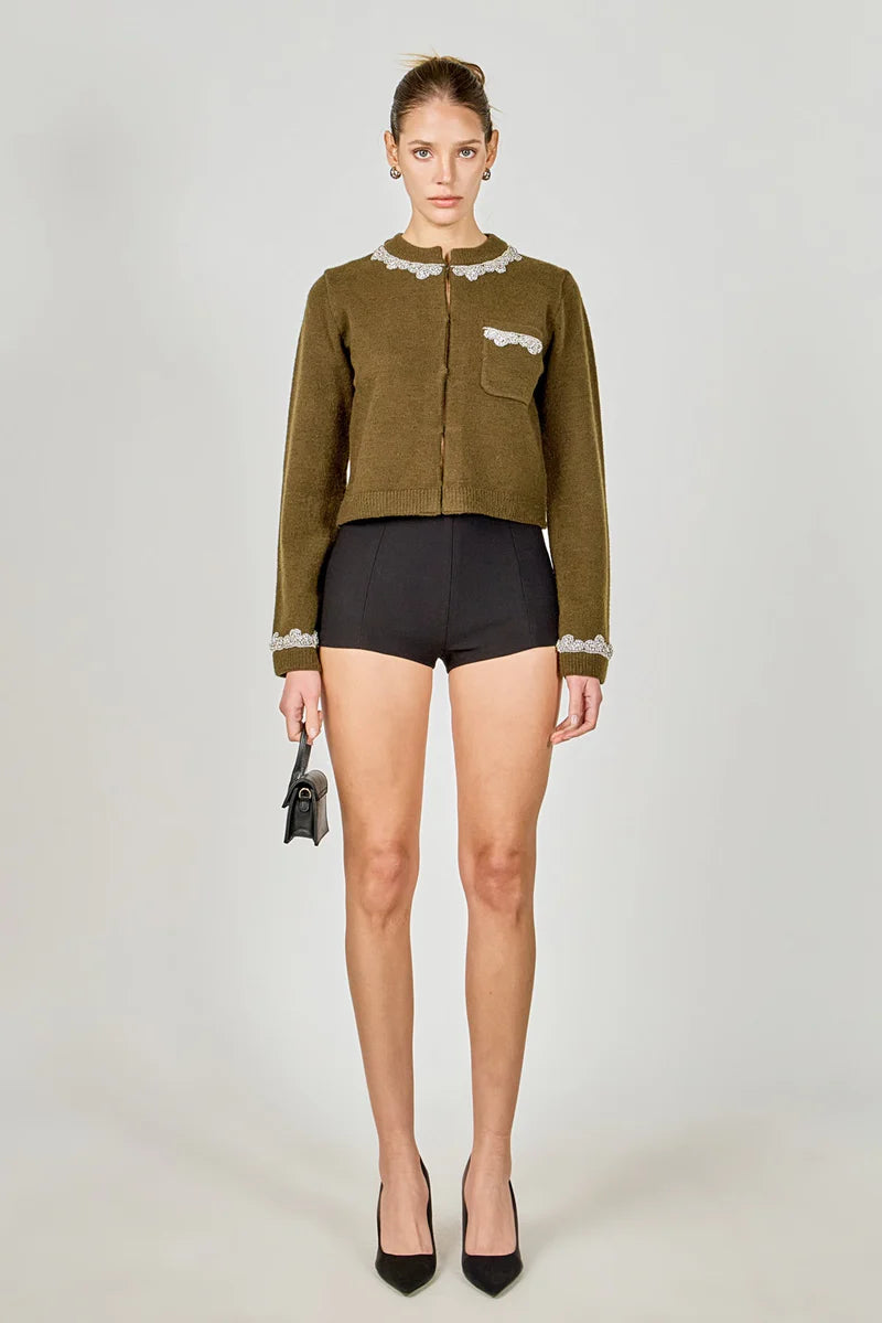 A classic silhouette with a touch of sparkle, this olive knit cardigan brings effortless sophistication to any wardrobe. Designed with a clean, collarless neckline and structured fit, it features delicate hook-and-eye front closures that create an elegant, streamlined look whether worn open or closed. Scalloped crystal embellishments trace the neckline, single chest pocket, and sleeve cuffs—adding a refined shimmer without overpowering the softness of the knit. The cropped length makes it perfect for pairing with high-waisted denim, sleek trousers, or a satin skirt for a polished day-to-night transition. A beautiful statement piece for holiday gatherings, winter dinners, or elevating everyday layers.
