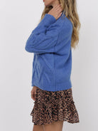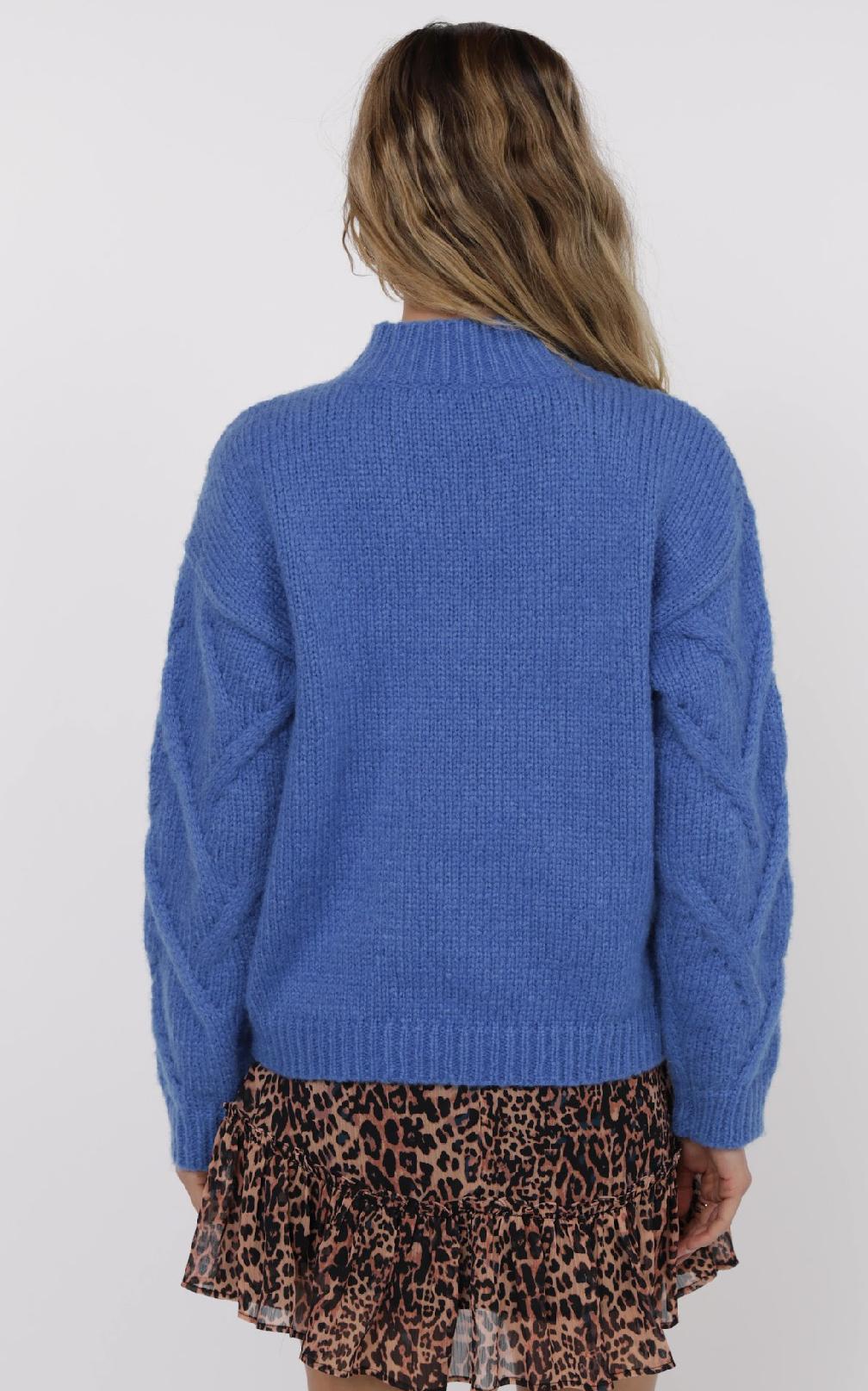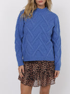 This sweater is a standout piece in a striking cobalt blue hue, designed with a cozy, chunky knit. It features an intricate cable knit pattern across the body and sleeves, adding both texture and dimension. The mock neckline gives it a modern, polished look, while the ribbed hem and cuffs provide structure and comfort. With its relaxed fit and soft feel, this sweater pairs perfectly with everything from denim to skirts, making it a versatile option for both casual and dressy styling. A bold yet timeless knit that brings warmth and style to any wardrobe. Shown here styled over our Wild Dreams Dress to bring out the little pops of blue in the dress.