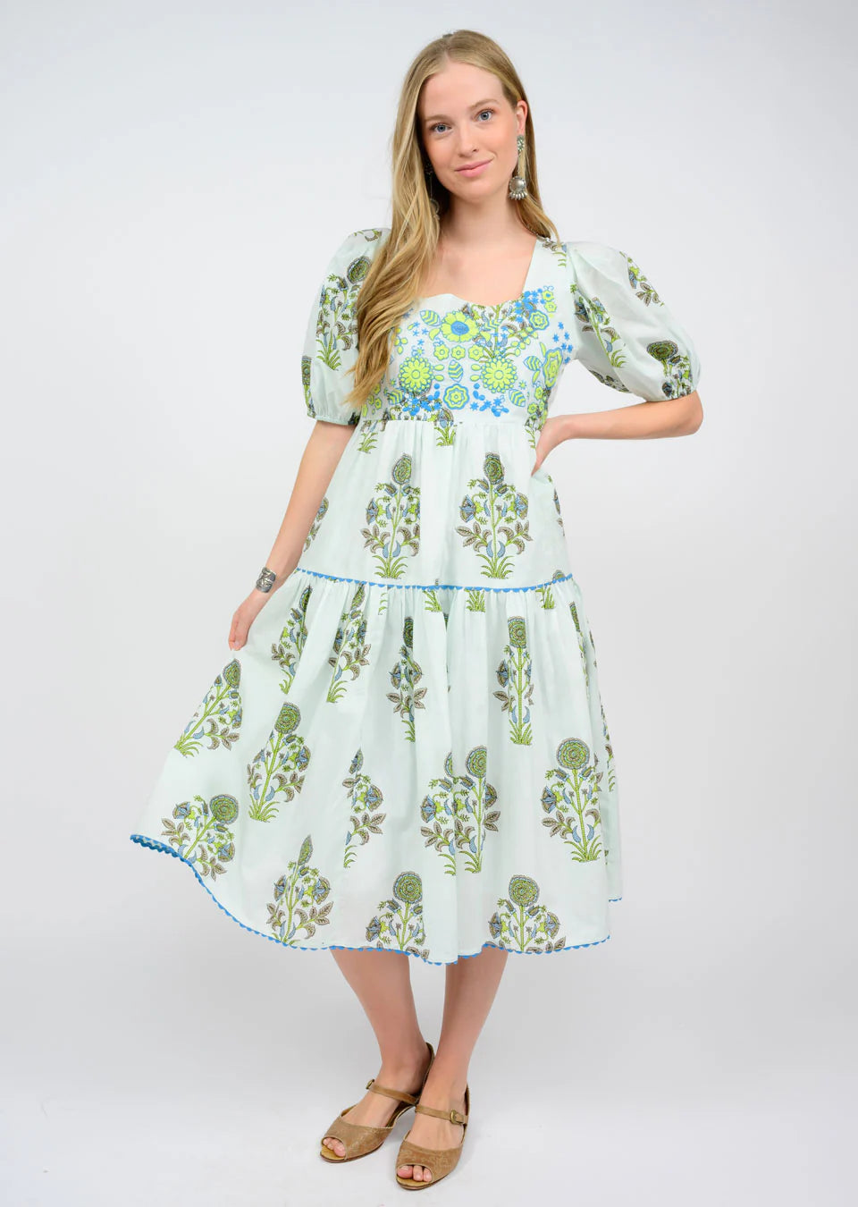 Beautiful details! This dress by Sister Mary features a light mint blue, lime and gray color palette that really pops. Finished off with beautiful embroidery on the bust and ric-rac trim on each tier. Wear this dress all Spring and Summer long. So cute with sandals or sneakers and perfect for vacations.