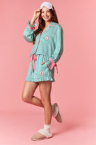 Bring a little glam to your holiday lounging with our Striped Christmas Tree Patch Pajama Set. This silky, lightweight two-piece features a classic green stripe pattern trimmed in soft pink velvet for the perfect pop of festive sweetness. The button-down top includes velvet piping, ruffled cuffs tied with dainty velvet bows, and a precious embroidered lace Christmas-tree patch that adds just the right touch of whimsy. The matching shorts offer an easy elastic waistband finished with a plush velvet drawstring bow and a flirty ruffle hem that keeps the look playful and feminine. The coordinating embroidered patch on the hem ties the entire set together for a polished, gift-ready finish. Cozy, cute, and picture-perfect for Christmas morning, girls’ holiday get-togethers, or matching family PJ photos—this set is the one you’ll reach for all season long.