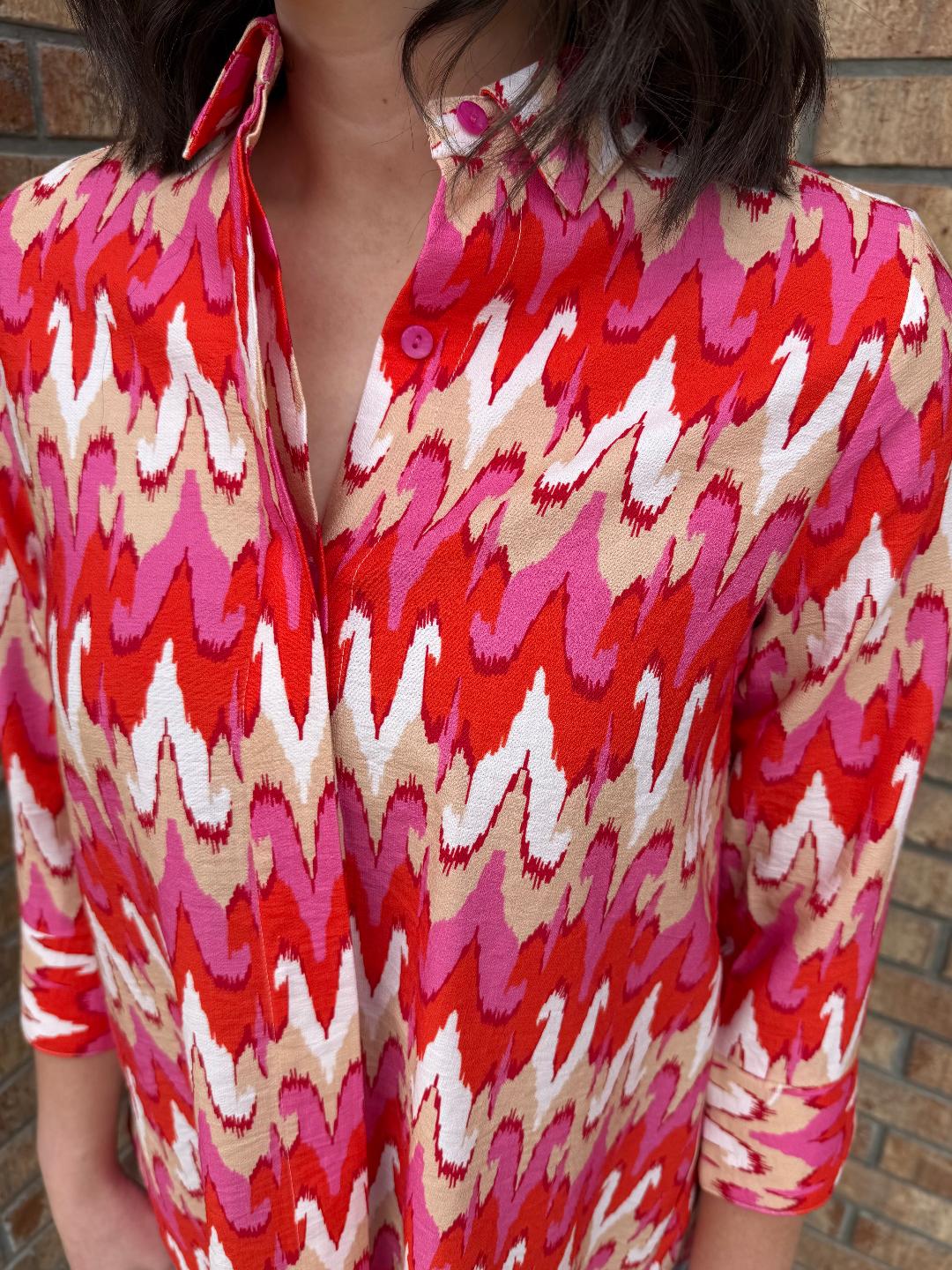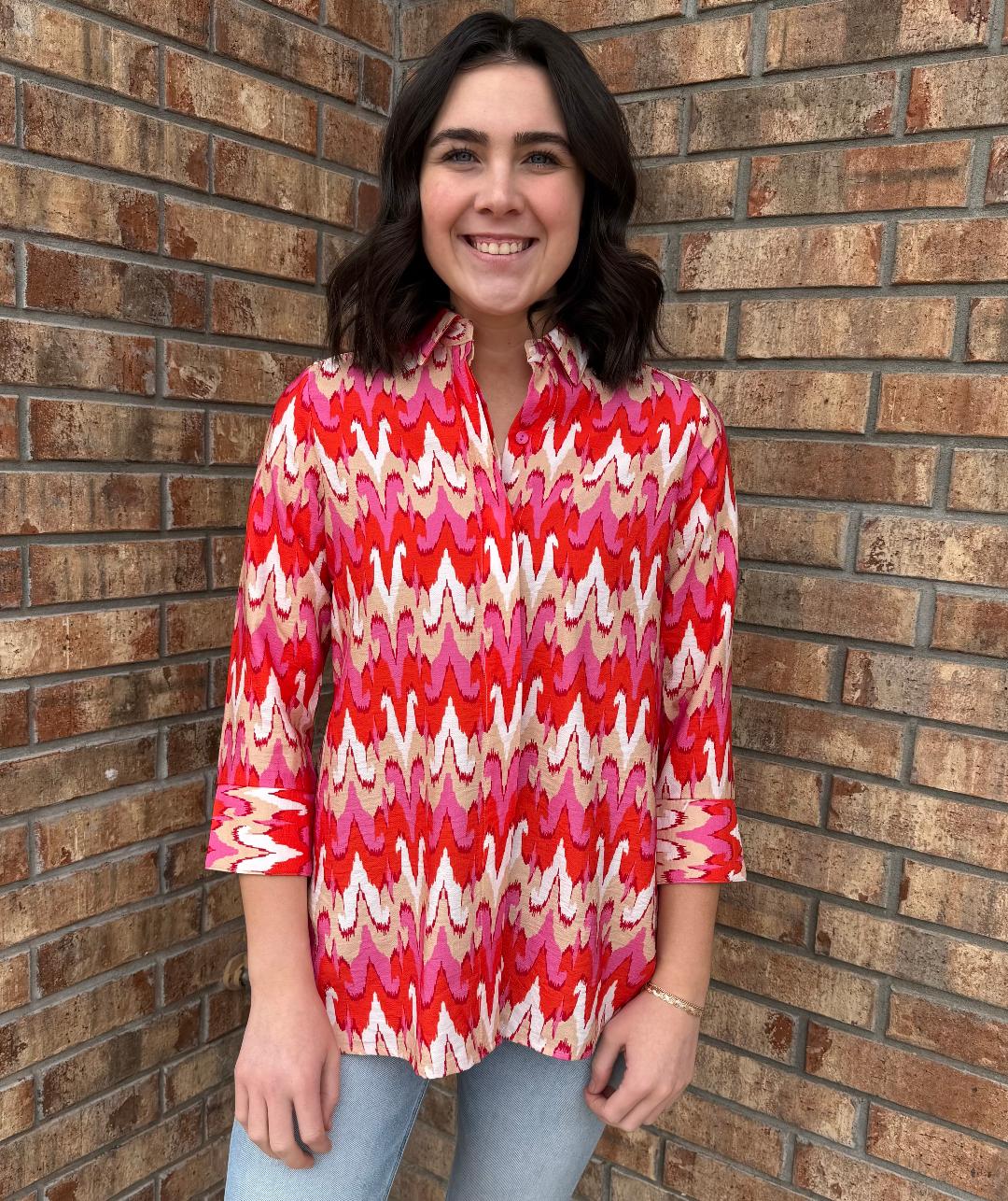 You will love the texture of this fabric and its bold color combo in a classic chevron-inspired print. Style back to white bottoms for a fresh pop.