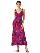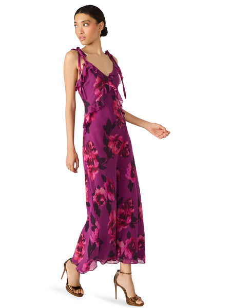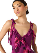 This romantic floral maxi dress is effortlessly feminine and striking. Designed in rich magenta tones with painterly rose prints, it features delicate tie straps that allow for an adjustable fit and soft ruffle detailing along the neckline and bodice for a fluttery, romantic touch. The flowy silhouette drapes beautifully to a full-length hem, creating graceful movement with every step. Perfect for weddings, parties, or date nights, this dress brings a blend of elegance and ease that feels timeless yet modern.