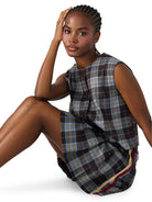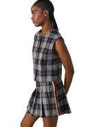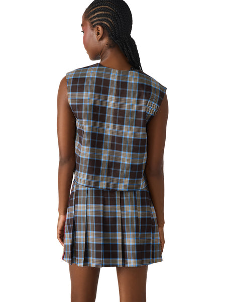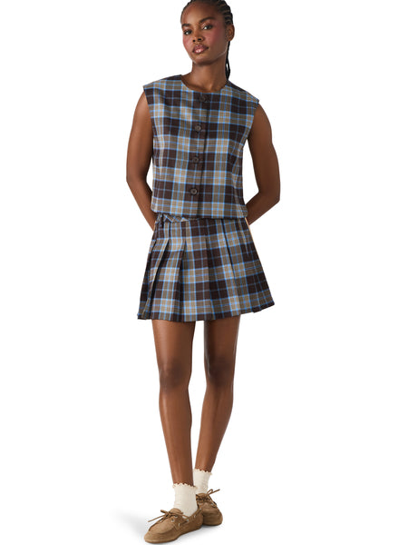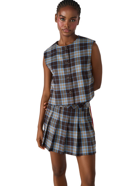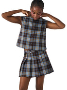 The Alessa Top redefines smart layering with a boxy silhouette and sleeveless cut. Featuring the same chocolate plaid as the Margo Skirt, this top has brown buttons and a structured, cropped fit for a touch of schoolgirl charm with a modern twist. Wear it as a set or mix and match with denim, trousers, or faux leather for endless outfit options.