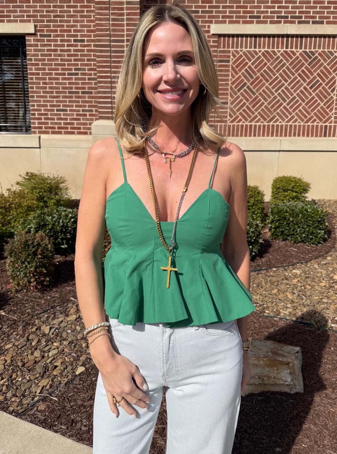 This flirty green peplum tank features a flattering structured bodice with a deep V neckline and delicate adjustable straps. The fitted top flows into a soft, flared hem that adds movement and a feminine touch. Lightweight and easy to wear, it’s the perfect statement piece to pair with denim or trousers for an effortlessly chic look. Shown with our jeans HERE and green trousers HERE.