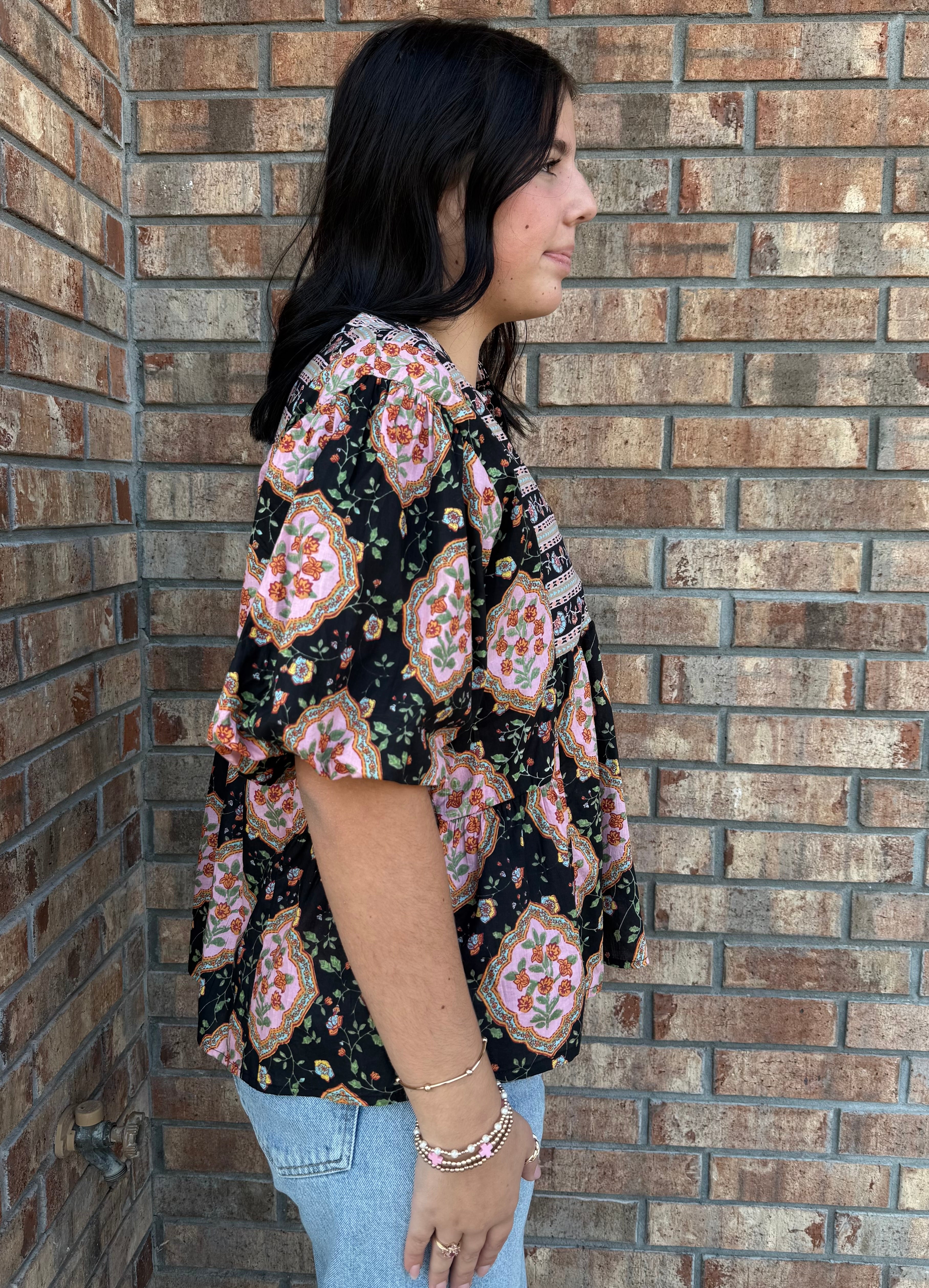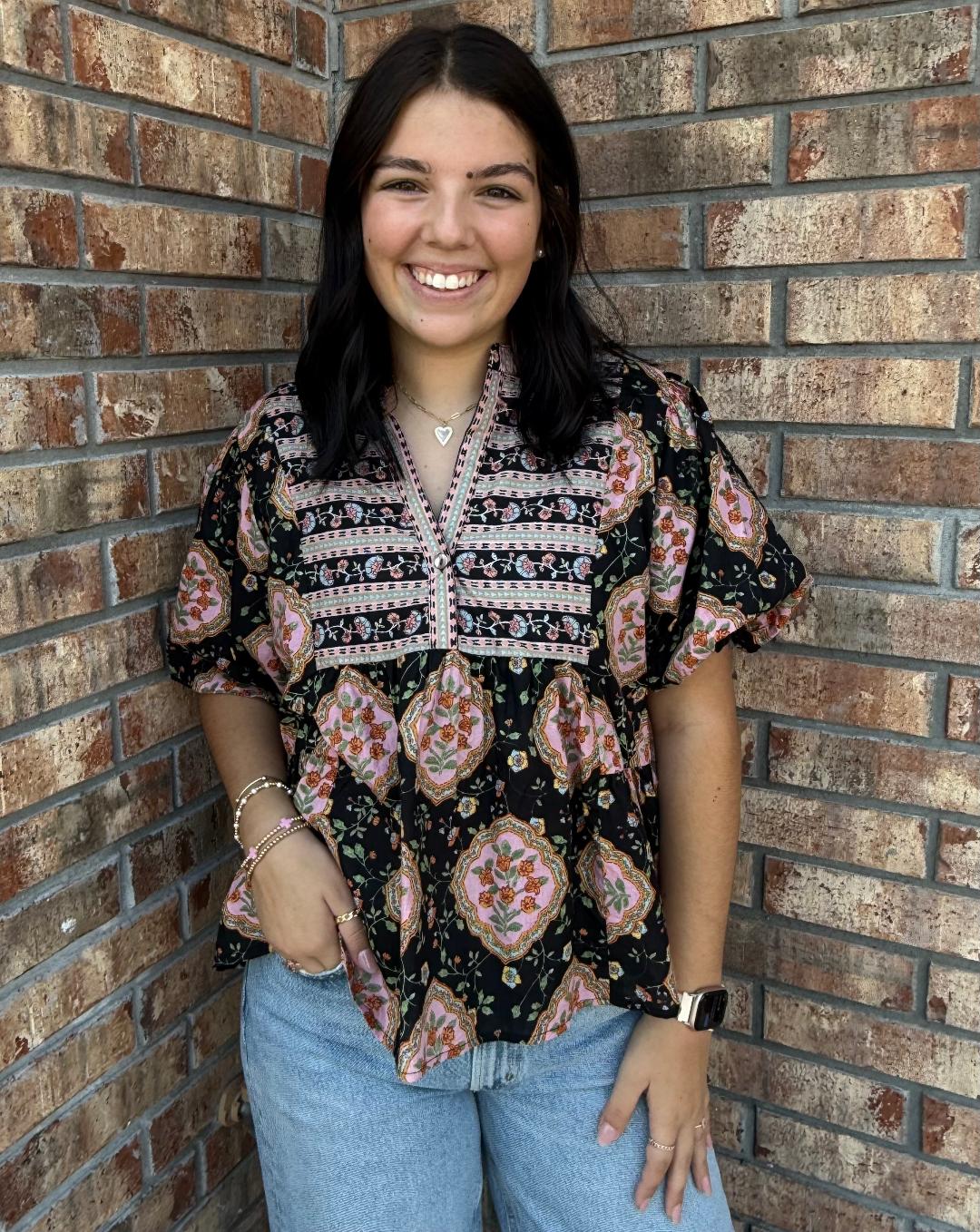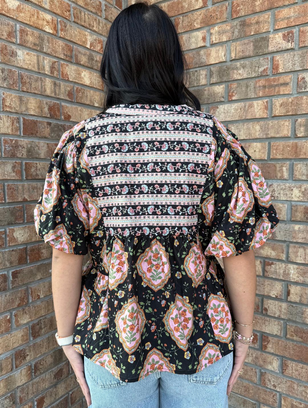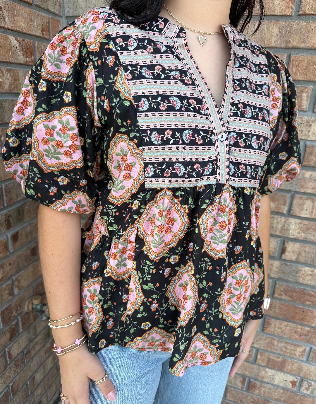 This top has a playful, boho-inspired look with its mix of floral medallion and striped patterns. The fabric is lightweight cotton and flowy, perfect for warm-weather styling. The bubble sleeves add a touch of volume and charm, while the split neckline with button detail and banded collar keeps it structured. The silhouette is relaxed and slightly flared, making it flattering and easy to wear with denim, trousers or shorts. The combination of prints gives it a folk-inspired, eclectic vibe that feels both modern and timeless.