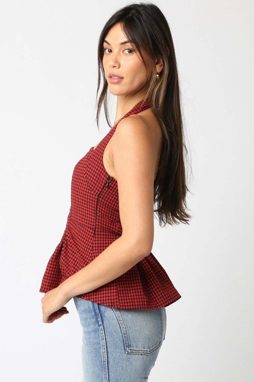 Sweet with a touch of sass, the Briana Checkered Halter Top is a retro-inspired charmer. This red and black gingham piece features a flattering halter neckline that ties at the back, a smocked back panel for a perfect fit, and a flared peplum hem that adds a playful shape. Button-down detailing in front completes the vintage vibe, making it a standout choice for pairing with denim, skirts, or layered under a jacket. Ideal for brunch dates, concerts, game days or those spontaneous weekend plans.