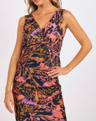 The Butterfly Kiss Twist Front Top is a vibrant statement piece featuring an abstract butterfly-inspired print in rich tones of coral, magenta, olive, and black. Designed with a flattering V-neckline and a twist-front detail that accentuates the waist this sleeveless top offers both structure and softness. The back features a subtle V-shape, enhancing its feminine silhouette. Perfect for pairing with its matching skirt or high-waisted denim for a bold, fashion-forward look for any season.